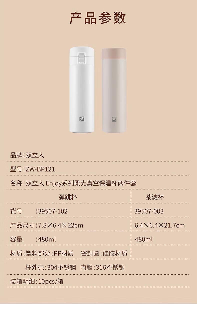 产品货号:弹跳杯:39507-102、茶滤杯:39507-003 产品材质:弹跳杯:杯外壳:304不锈钢 内胆:316不锈钢 塑料部分:PP材质 密封圈:硅胶材质 茶滤杯:杯外壳:304不锈钢 内胆:316不锈钢 产品尺寸:弹跳杯:7.8×6.4×22cm、茶滤杯:6.4×6.4×21.7cm 容量 :弹跳杯:480ml、茶滤杯:480ml 装 箱明细:10pcs/箱