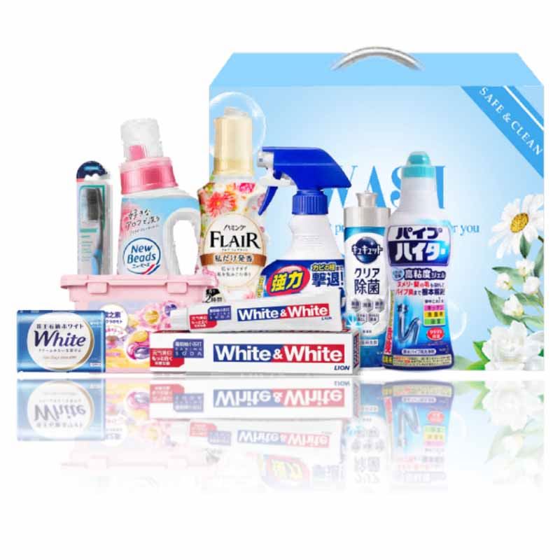 【套装配置】(香型随机/新老包装随机) 1.花王持久留香柔软护色洗衣液690g*1 2.花王持久留香衣物柔顺剂520ml*1 3.樱之素牙刷单支装*1 4.狮王葡萄柚小苏打元气美白牙膏120g*1 5.花王浴室强力泡沫清洁喷剂400ml*1 6.日本樱之素洗衣凝珠18粒*1 7.花王果蔬洗洁精220ml*1 8.花王天然植物护肤香皂130g*1 9.花王管道疏通剂500g*1 10.家清系列精美彩盒*1(390*150*310mm)