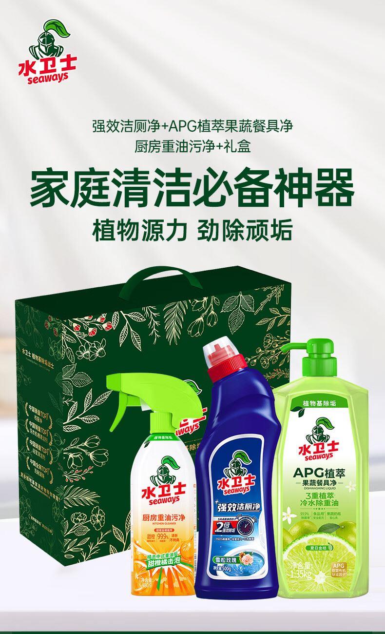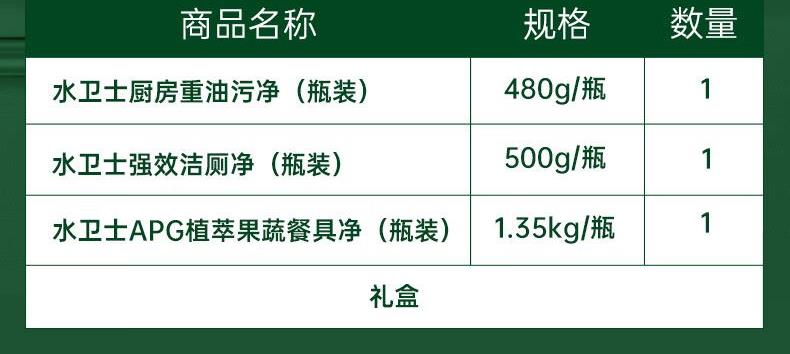 (1)水卫士厨房重油污净-带喷枪480g*1 (2)水卫士金桔洗洁精-带泵头1.35kg*1 (3)水卫士强效洁厕净500g*1