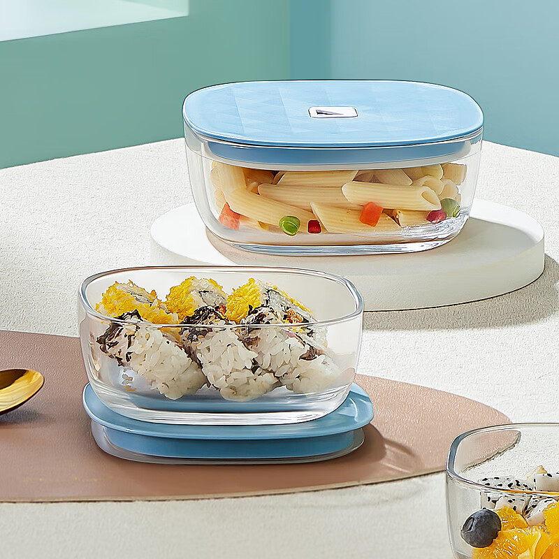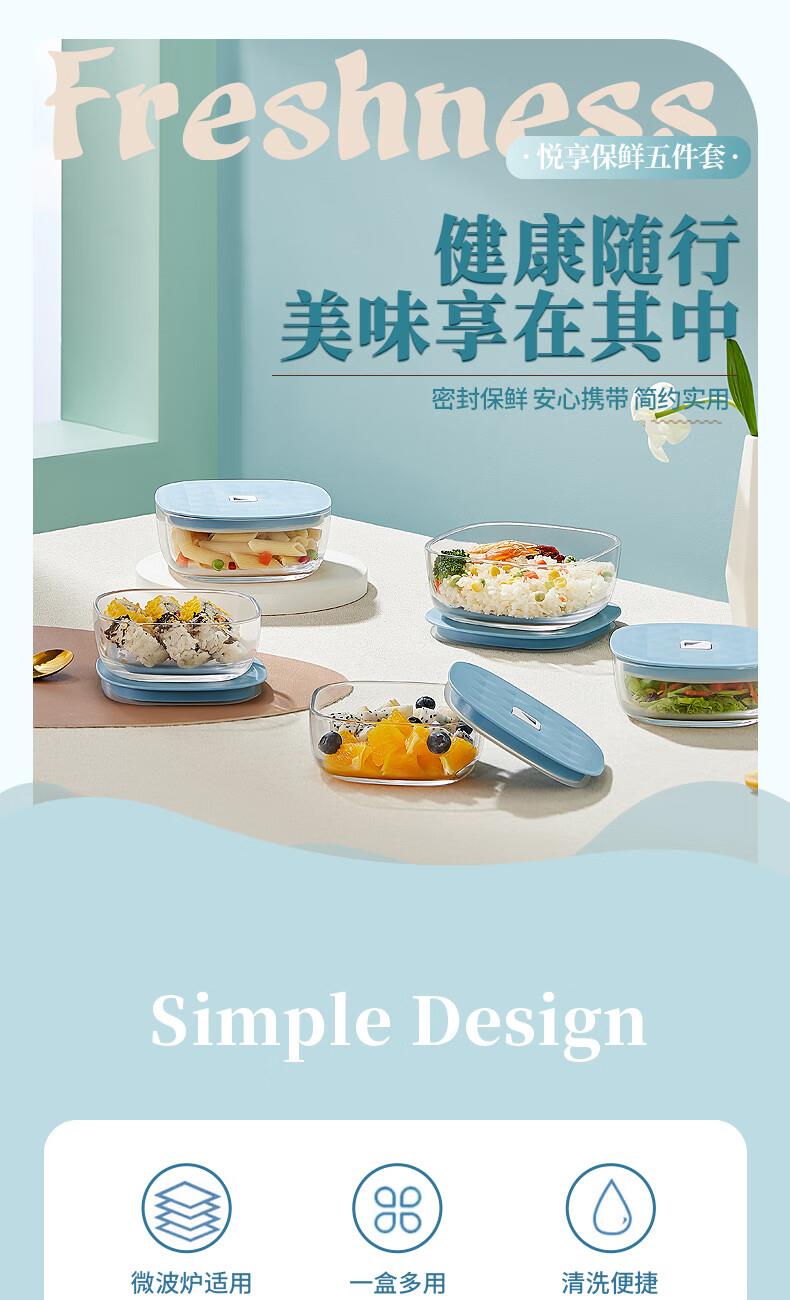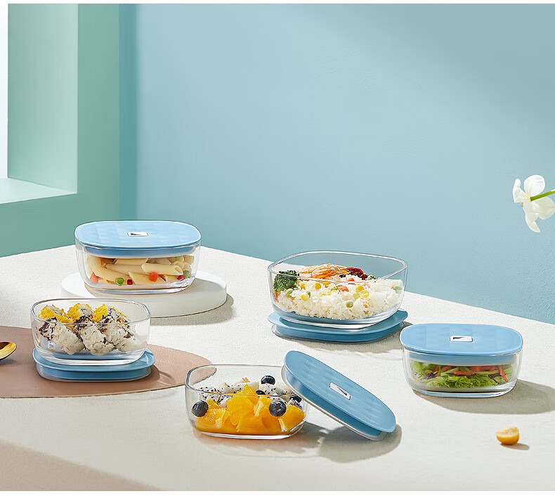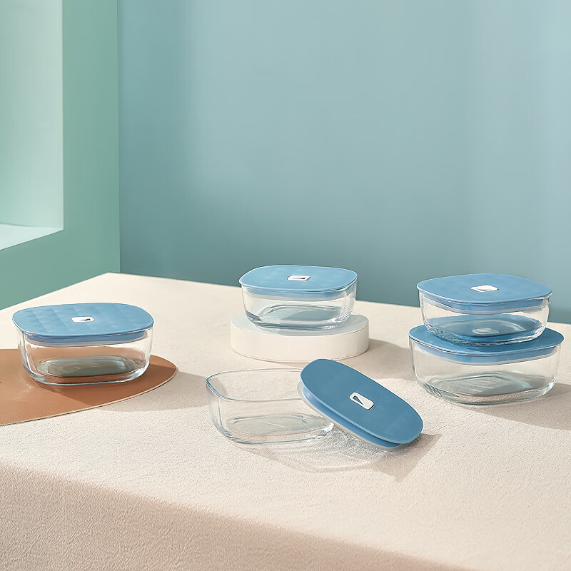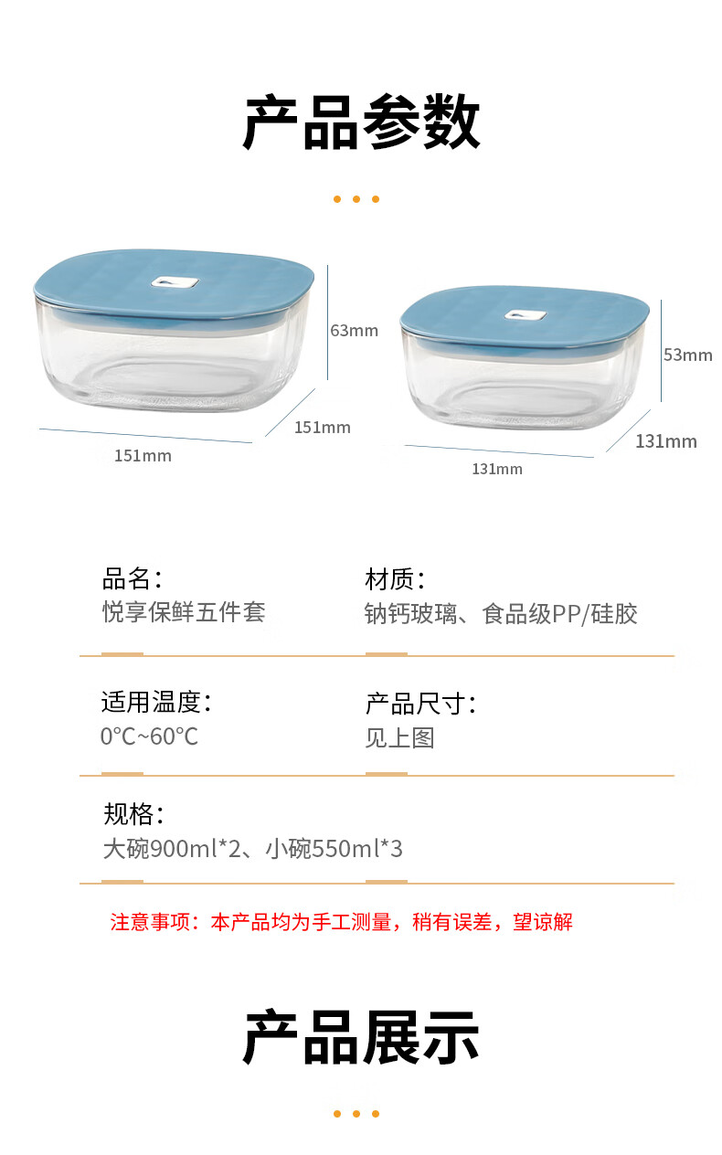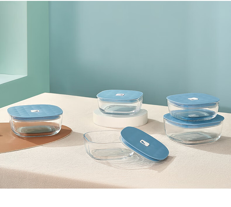 装 箱 规格:6套 /箱产品参数:大号保鲜碗900ml*2、中号保鲜碗550ml*3材 质:高白料钠钙玻璃,食品级硅胶,食品级pp彩盒尺寸:424*297*67mm 外箱尺寸:43.8*42.6*31.3cm