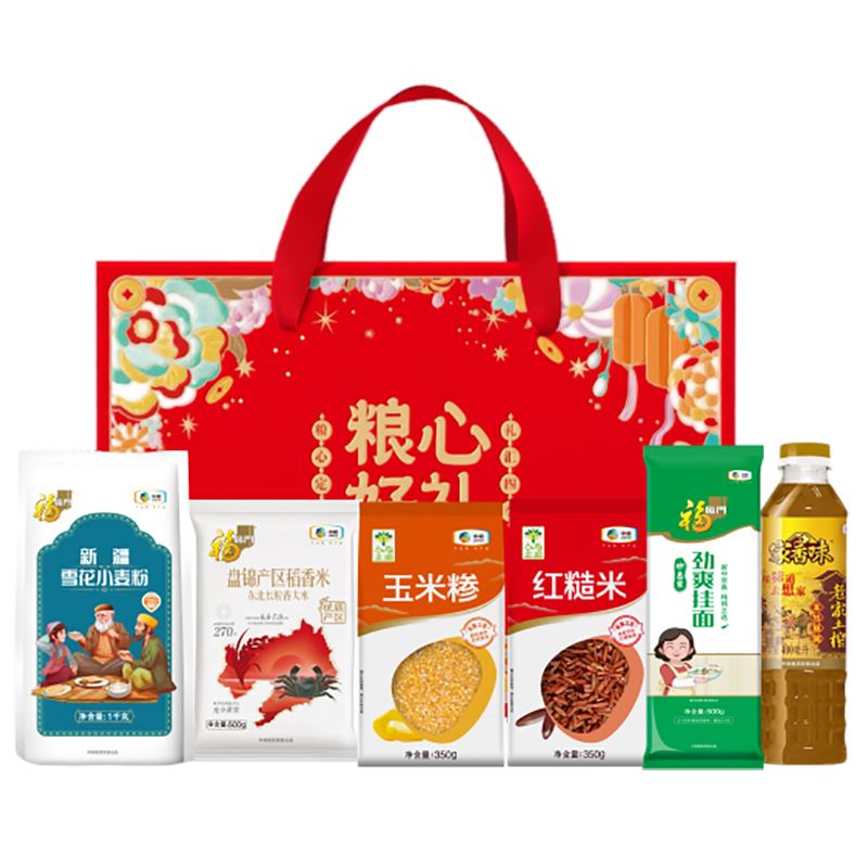 净含量:2700g+400ml 内 配: 中粮福临门盘锦长粒香米500g 中粮金盈红糙米350g 中粮金盈玉米糁350g 中粮福临门新疆雪花小麦粉1kg 中粮福临门妙惠家挂面500g 中粮福临门老家土榨菜籽油400ml