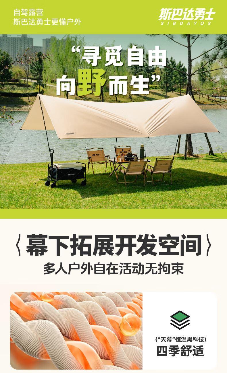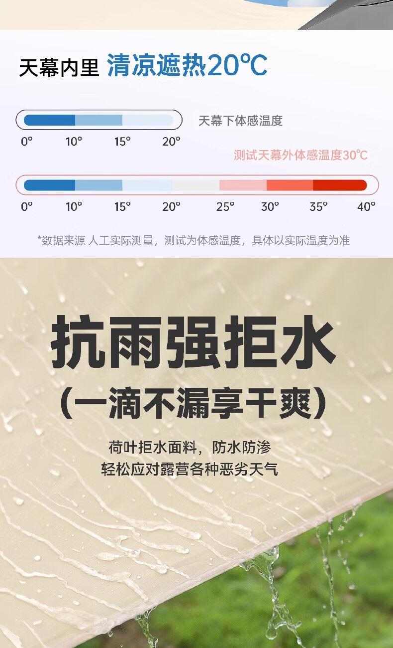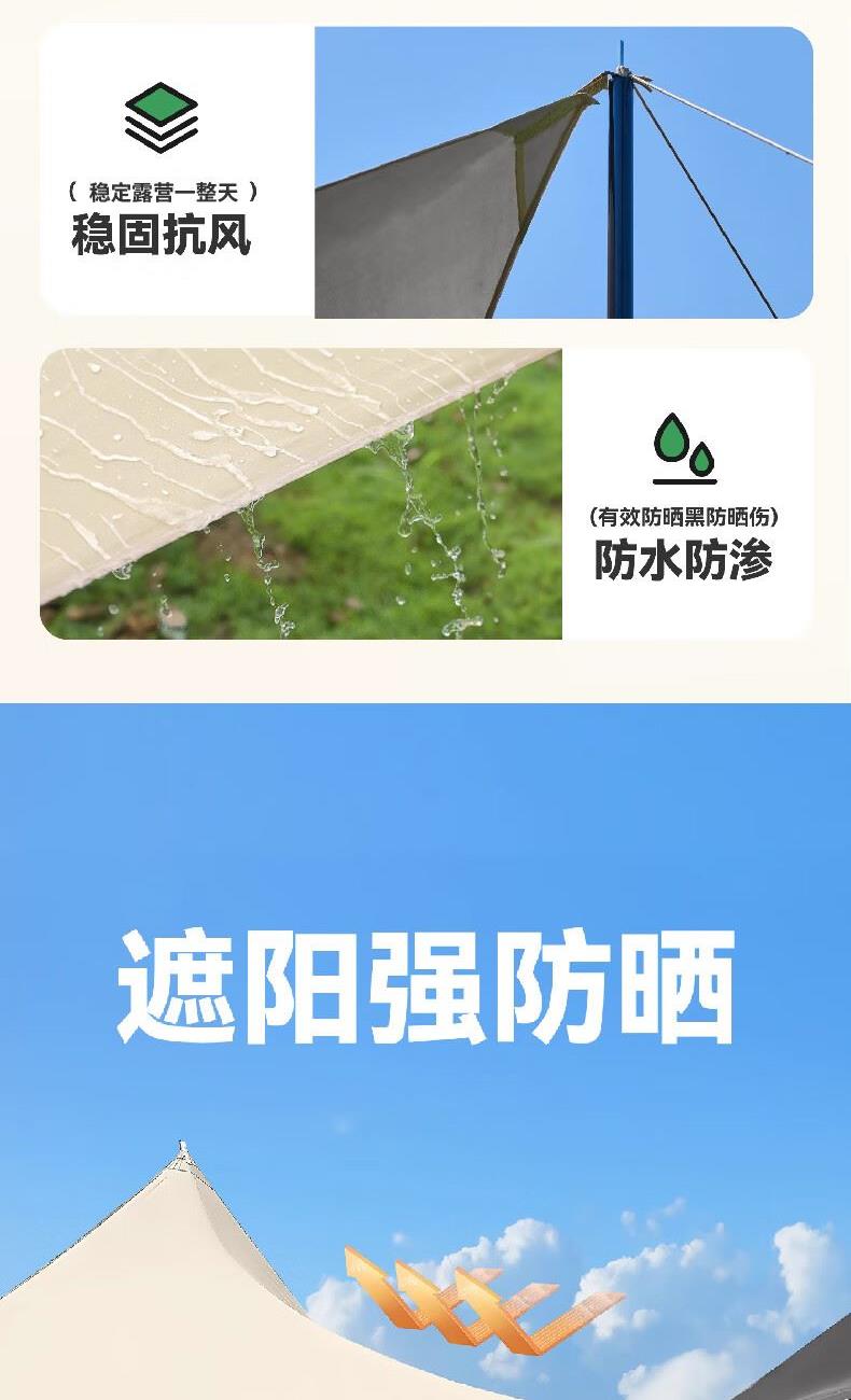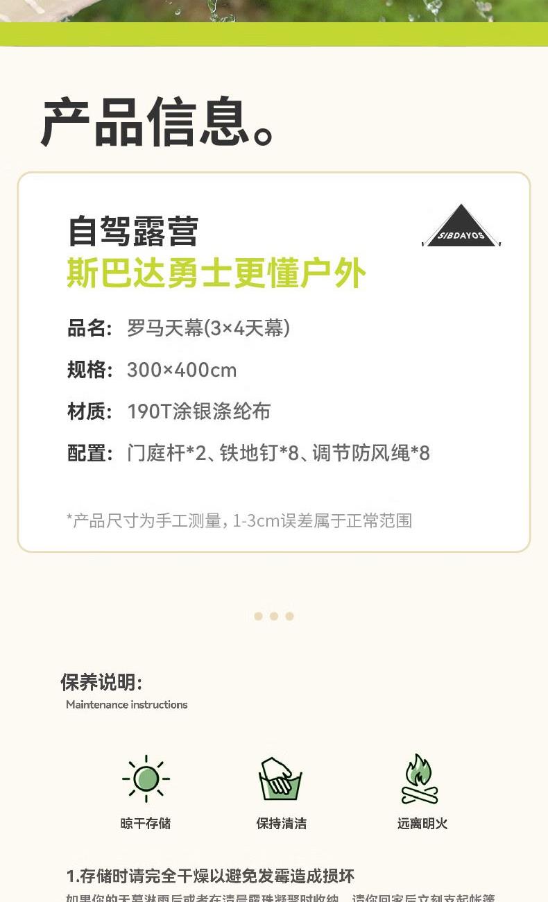规格:300×400cm 材质:190T涂银涤纶布 配置:门庭杆*2、铁地钉*8、调节防风绳*8 条形码:6978388730038