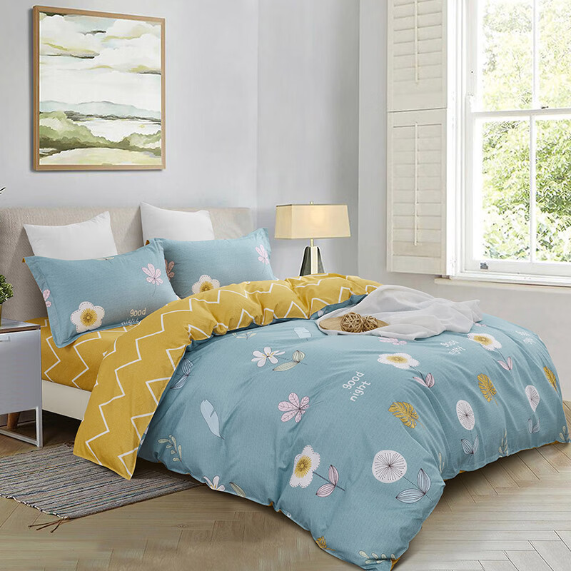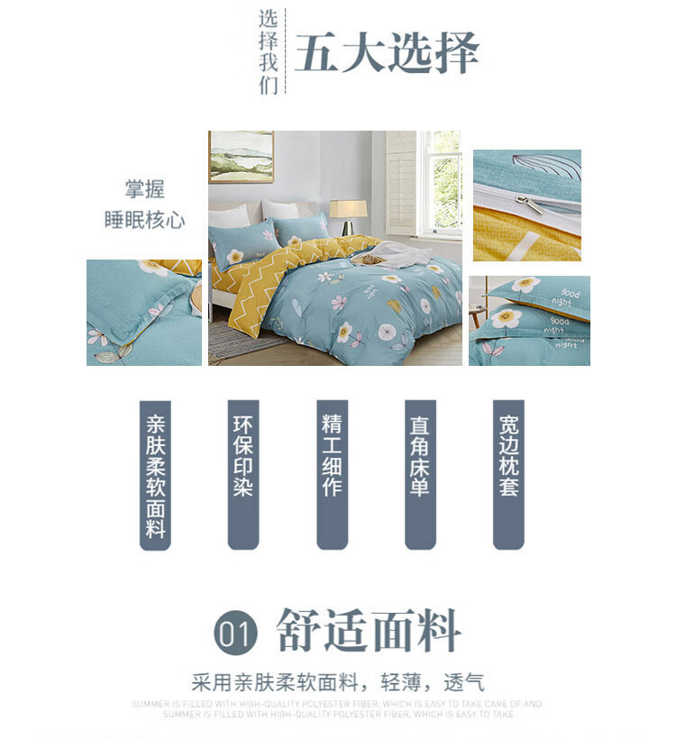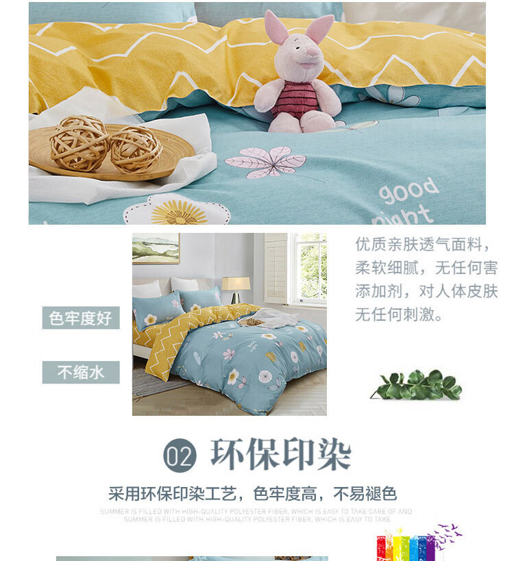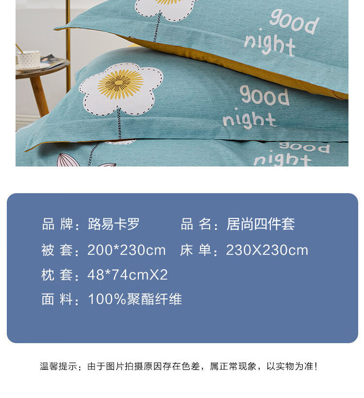 货 号:LK-6322 面 料:生态棉(聚酯纤维) 规 格:被套:200 x 230 cm 床单:230*230cm 枕套:48*74cm*2