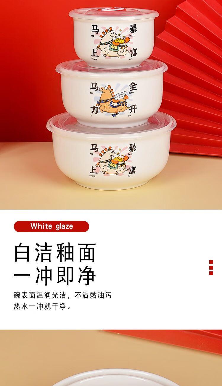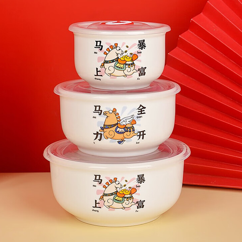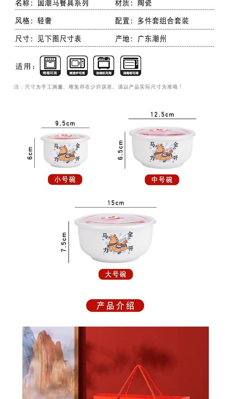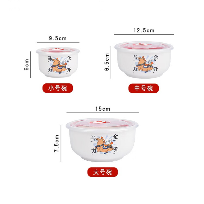 产品组成:整套=大中小陶瓷碗+保鲜盖+彩盒 产品材质:强化瓷 产品规 格:大号碗=口径15cm,高7.5cm;中号碗=口径12.5cm,高6.5cm;小号碗=口径9.5cm,高6cm 彩盒尺寸:28×26.5×8cm 外箱毛重:25kg 外箱尺寸:57×40×50cm 产品 装 箱:20套 / 箱