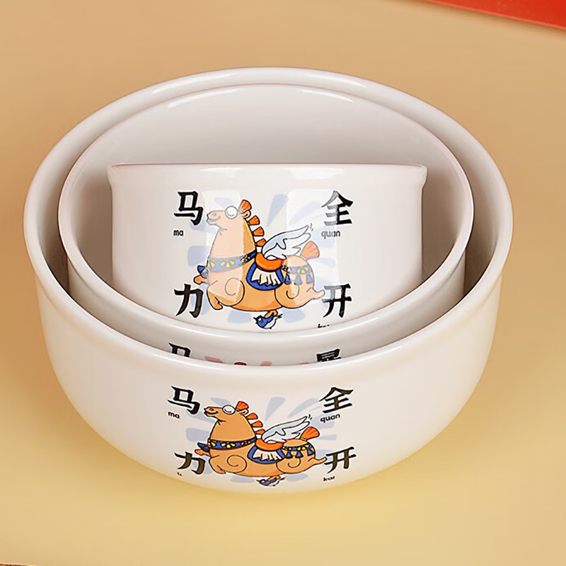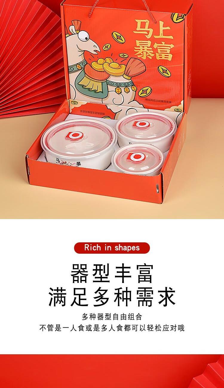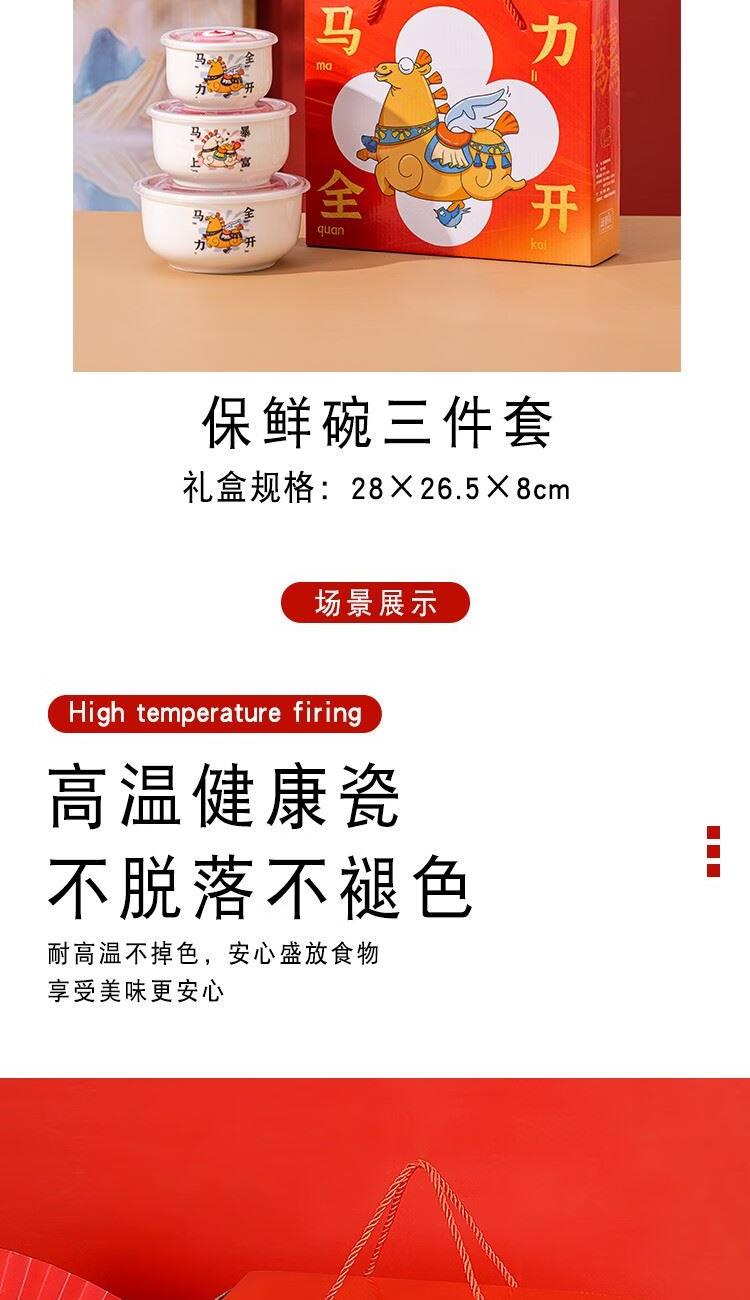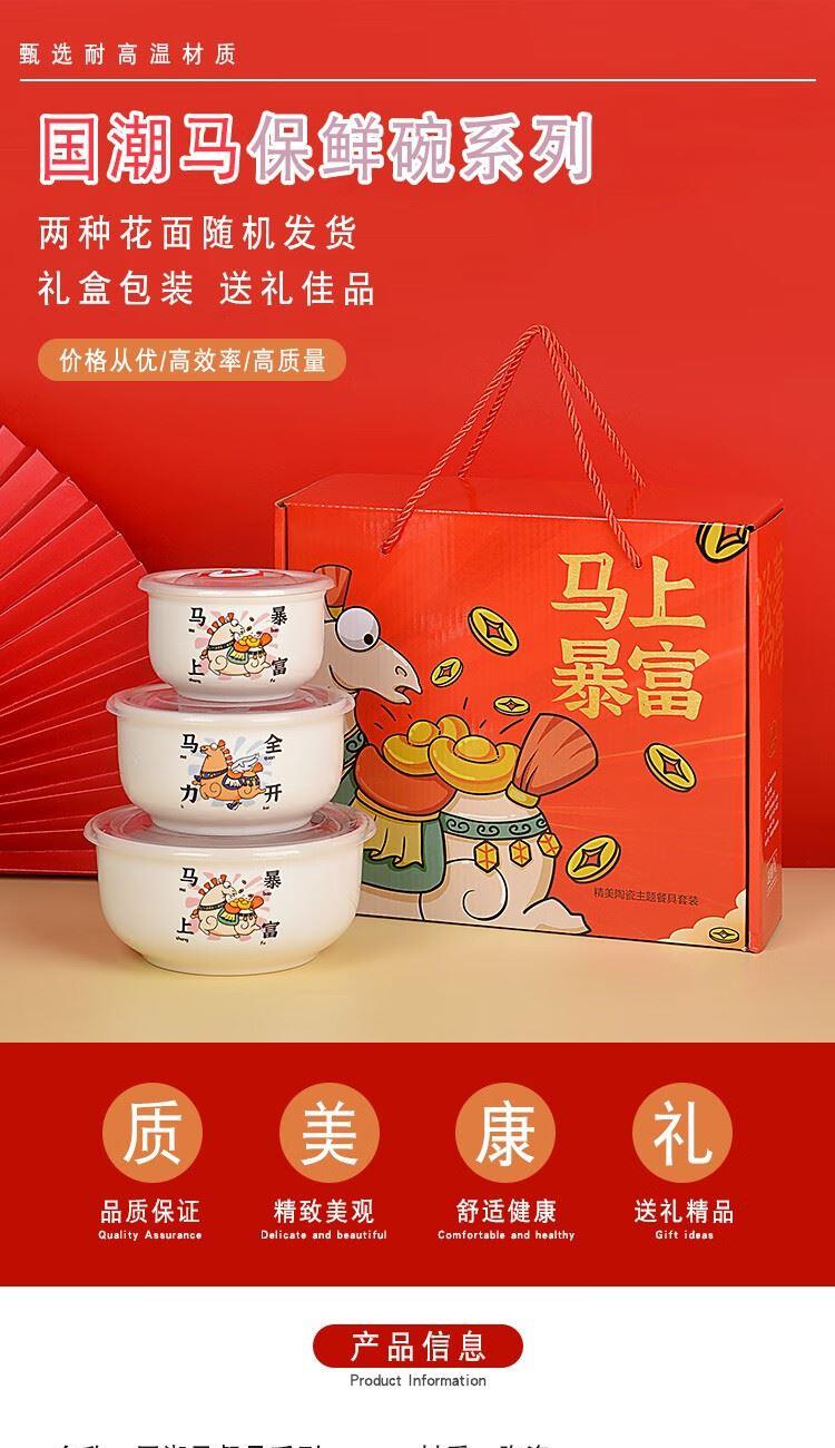 产品组成:整套=大中小陶瓷碗+保鲜盖+彩盒 产品材质:强化瓷 产品规 格:大号碗=口径15cm,高7.5cm;中号碗=口径12.5cm,高6.5cm;小号碗=口径9.5cm,高6cm 彩盒尺寸:28×26.5×8cm 外箱毛重:25kg 外箱尺寸:57×40×50cm 产品 装 箱:20套 / 箱