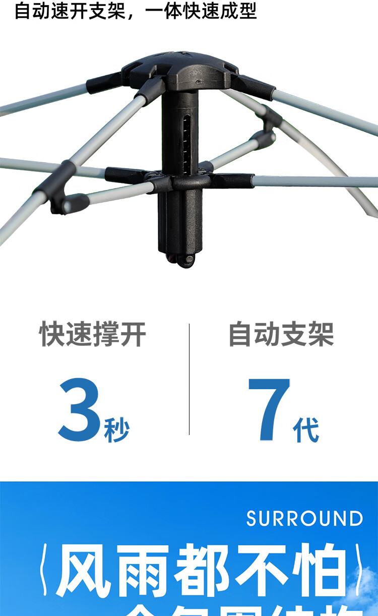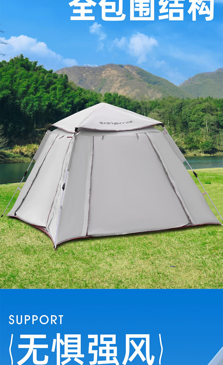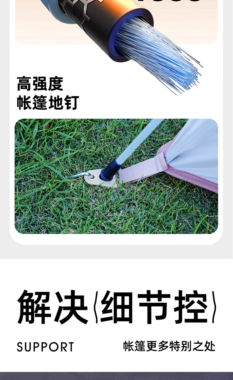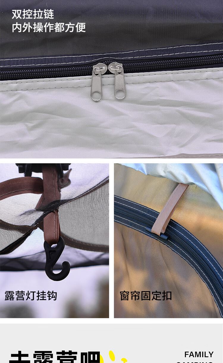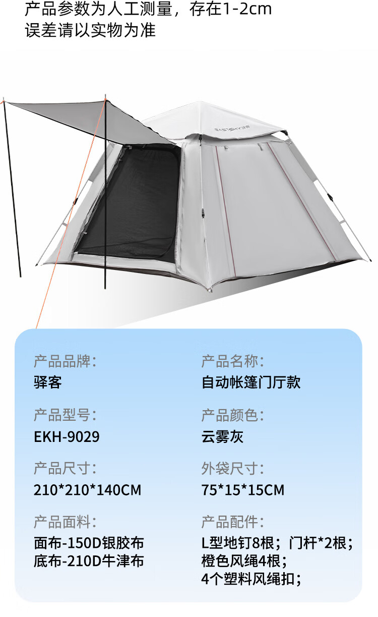 产品尺寸:210*210*140cm 外袋:75*15*15cm 配件:L型地钉8根、门杆2根、橙色风绳4根、4个塑料风绳扣、