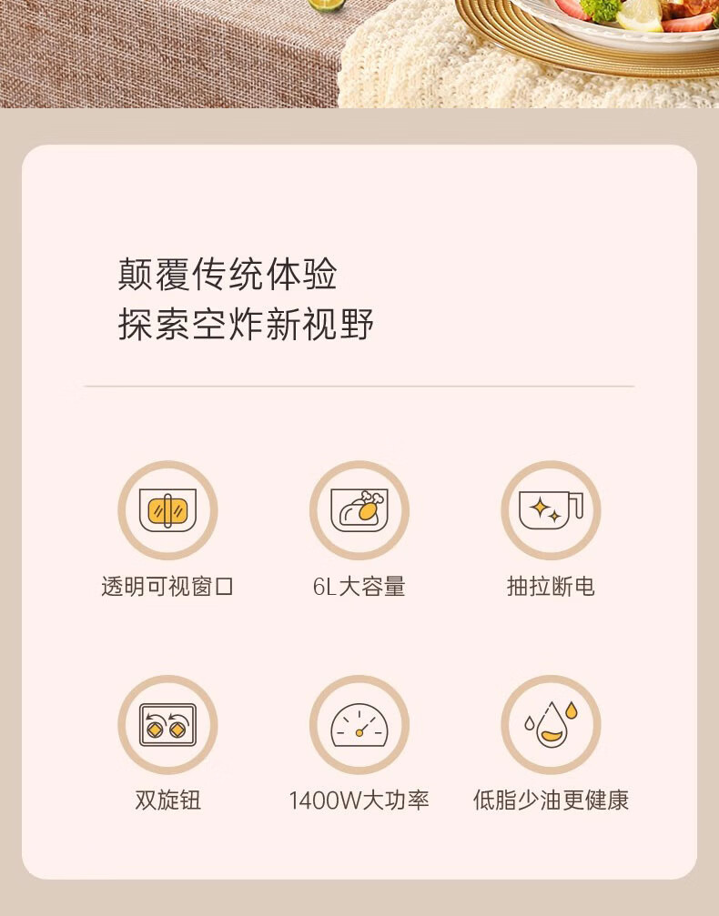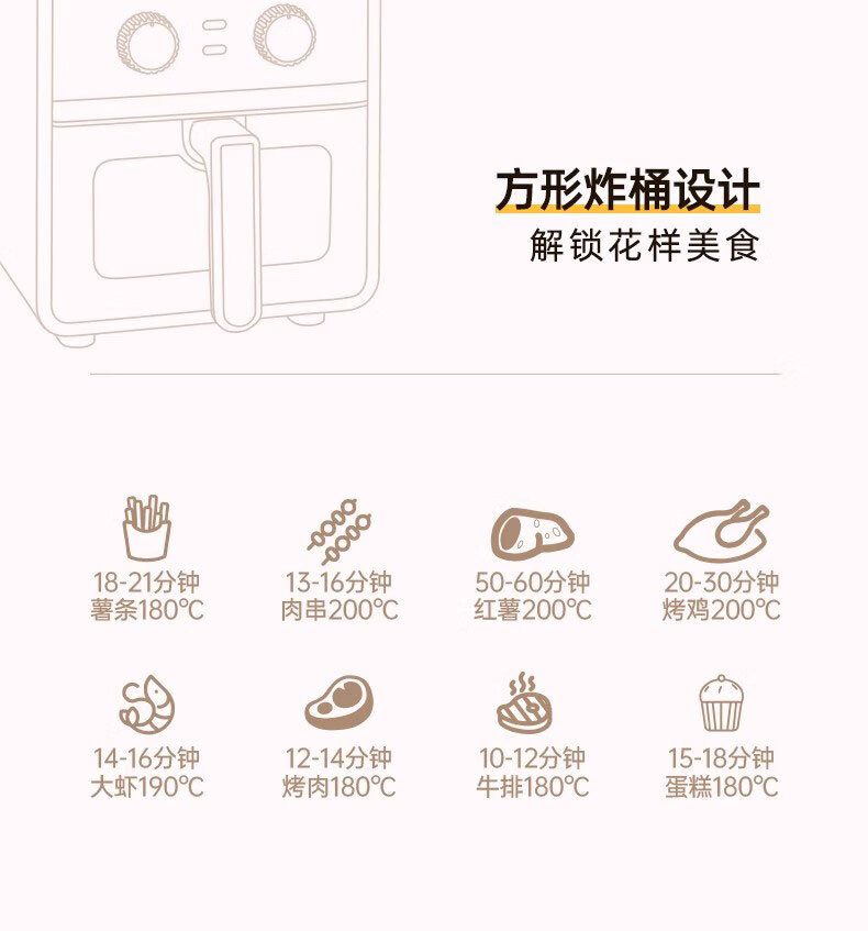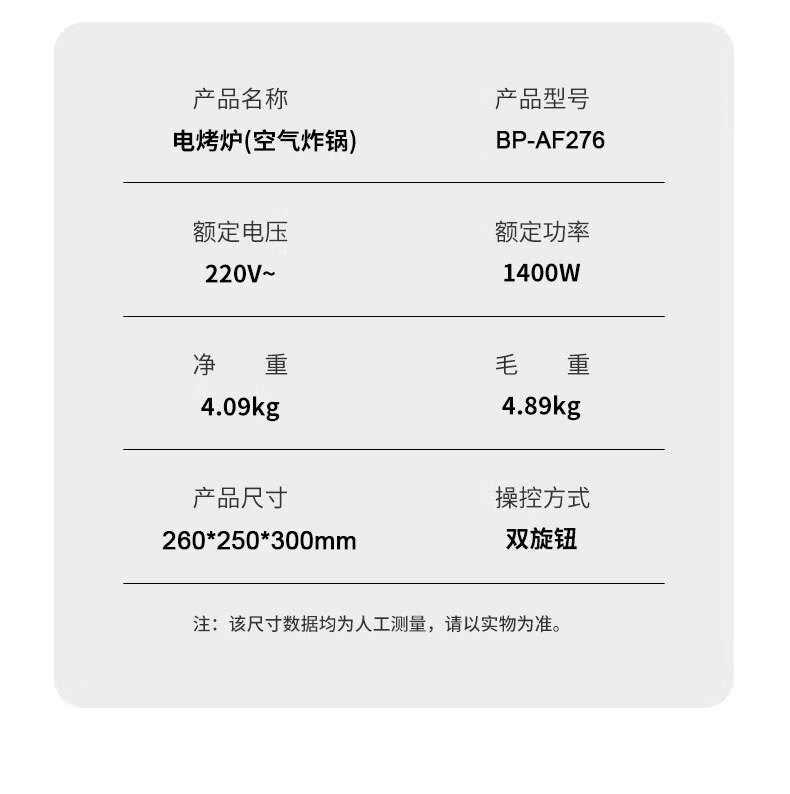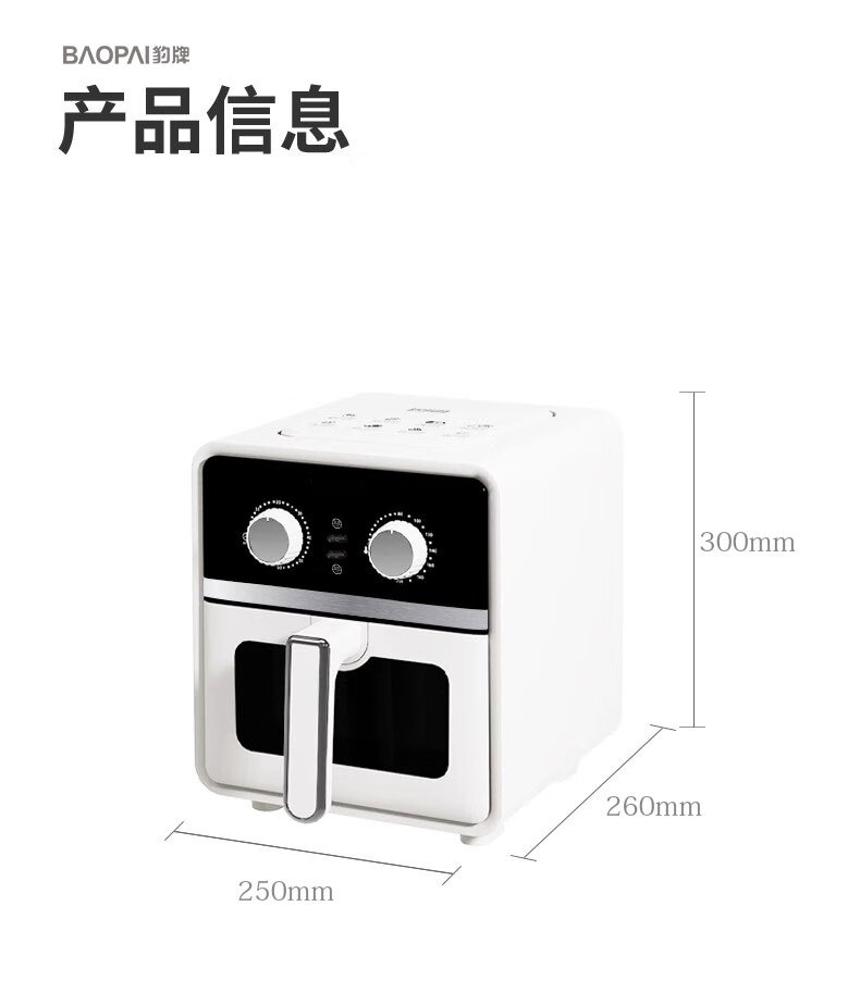 产品材质:PP+ABS炸篮容量:6L 额定功率:1400W 额定电压/频率:220V~/50Hz 产品重量:4kg 产品尺寸:260*250*300mm 包装尺寸:393*325*345mm 装 箱 数量:4台 外箱尺寸:680*410*710mm