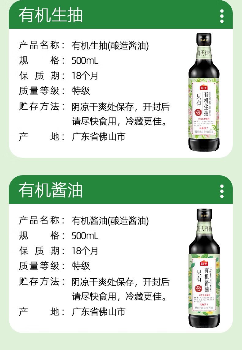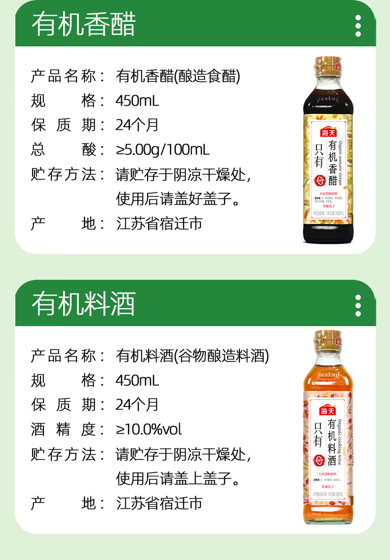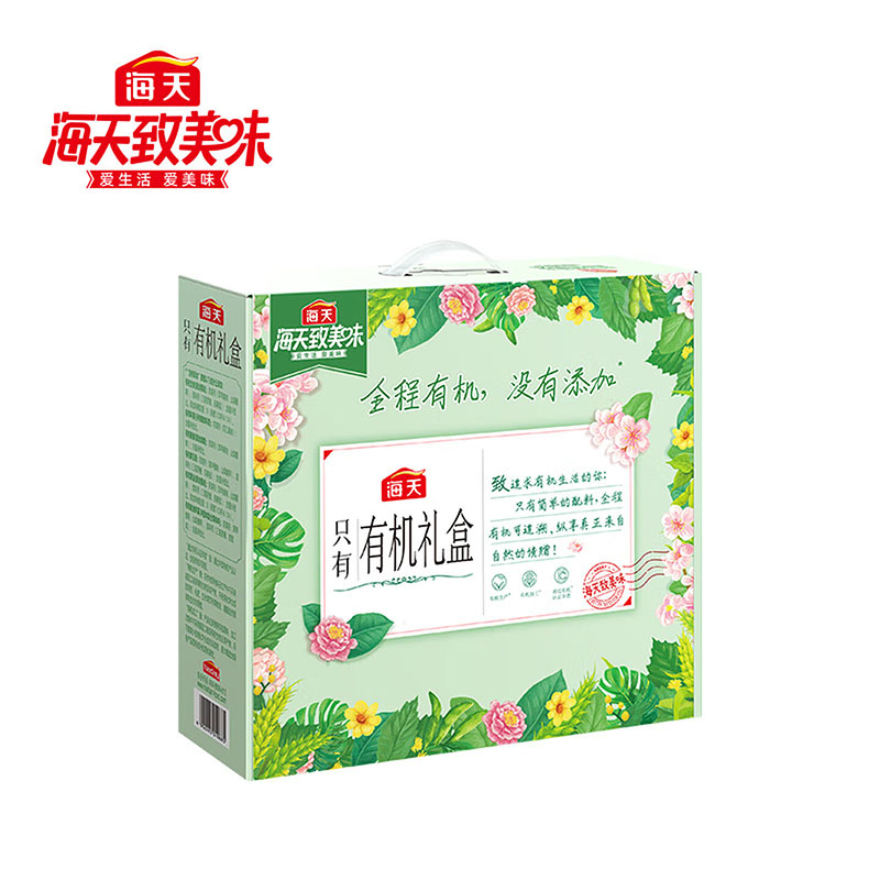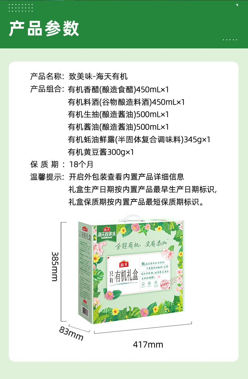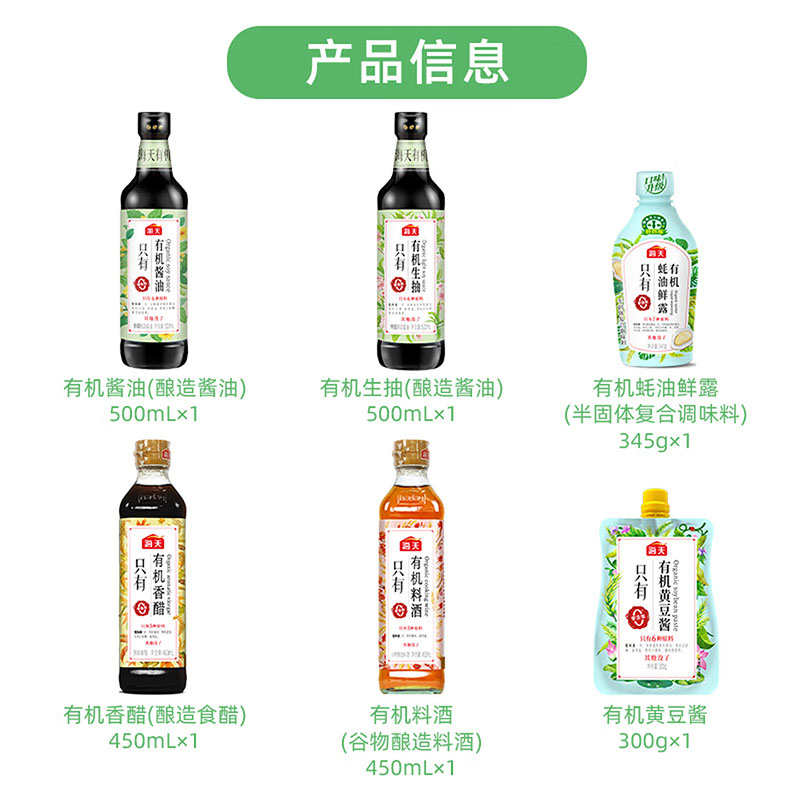 净含量:1900ml+645g内配: 海天有机生抽 500ml 海天有机酱油 500ml 海天有机香醋 450ml 海天有机料酒 450ml 海天有机黄豆酱 300g 海天有机蚝油鲜露 345g