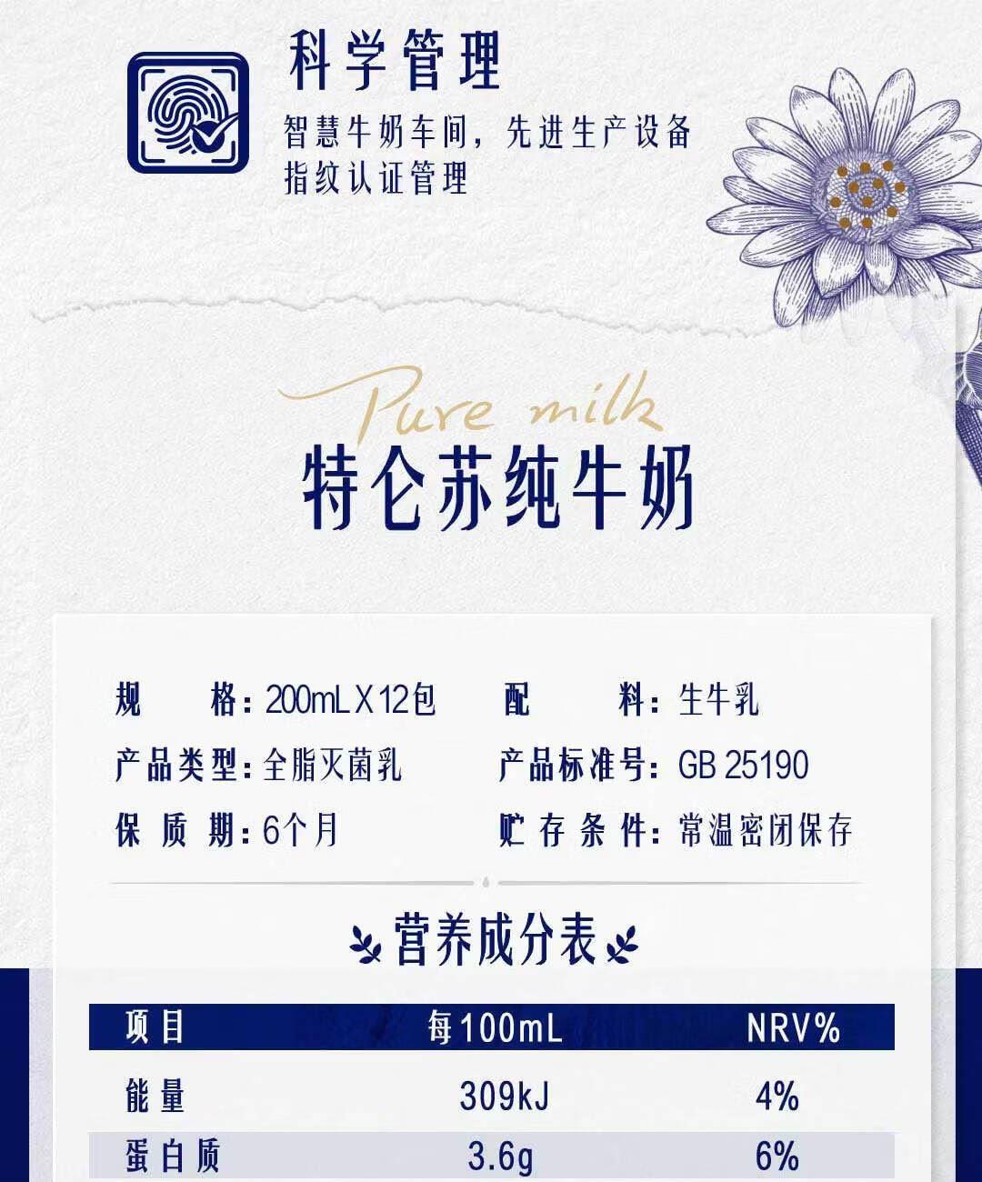 特仑苏有机纯牛奶全脂灭菌乳利乐苗条装12*250ml