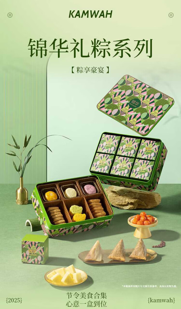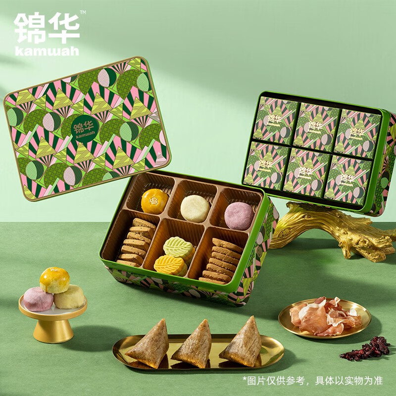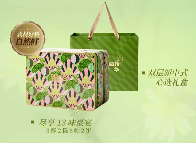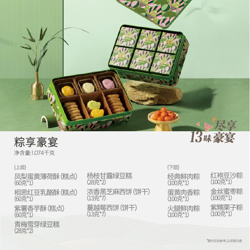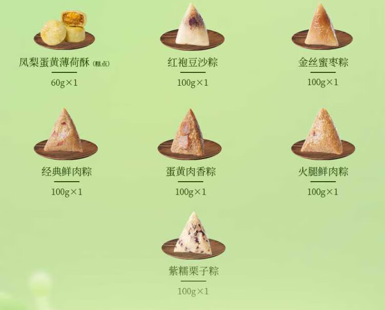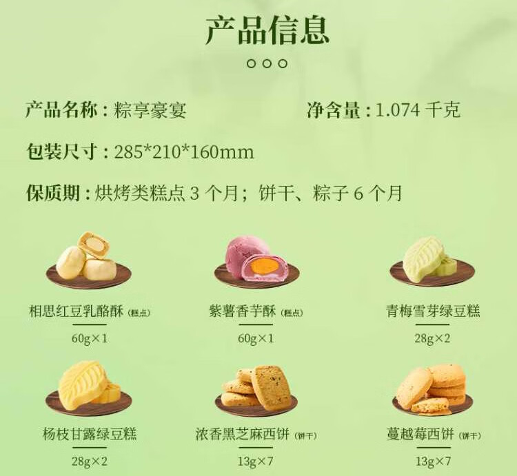 凤梨蛋黄薄荷酥(糕点)60g*1 相思红豆乳酪酥(糕点)60g*1 紫薯香芋酥(糕点)60g*1 青梅雪芽绿豆糕28g*2 杨枝甘露绿豆糕28g*2 浓香黑芝麻西饼(饼干)13g*7 蔓越莓西饼(饼干)13g*7 经典鲜肉粽100g*1 蛋黄肉香粽100g*1 火腿鲜肉粽100g*1 红袍豆沙粽100g*1 金丝蜜枣粽100g*1 紫糯栗子粽100g*1