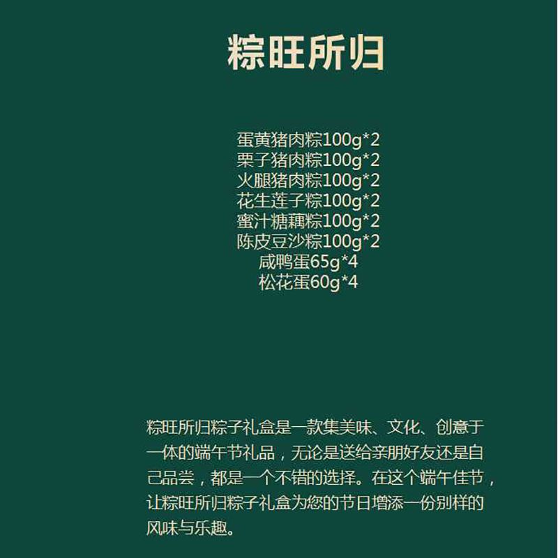 蛋黄猪肉粽100g*2 栗子猪肉粽100g*2 火腿猪肉粽100g*2 花生莲子粽100g*2 蜜汁糖藕粽100g*2 陈皮豆沙粽100g*2 咸鸭蛋65g*4 松花蛋60g*4