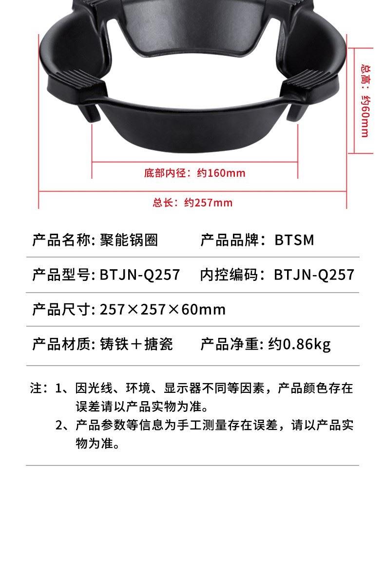 产品 名 称:聚能锅圈 产品型号:BTJN-Q257 内控编码:BTJN-Q257 产品净重:860g 产品材质:铸铁+搪瓷 产品尺寸:257x257x60mm