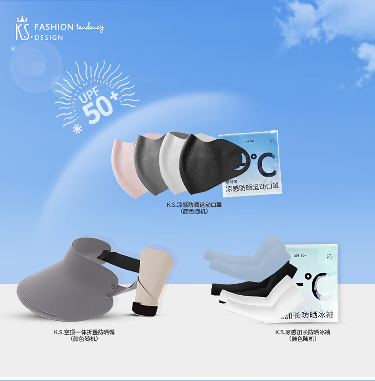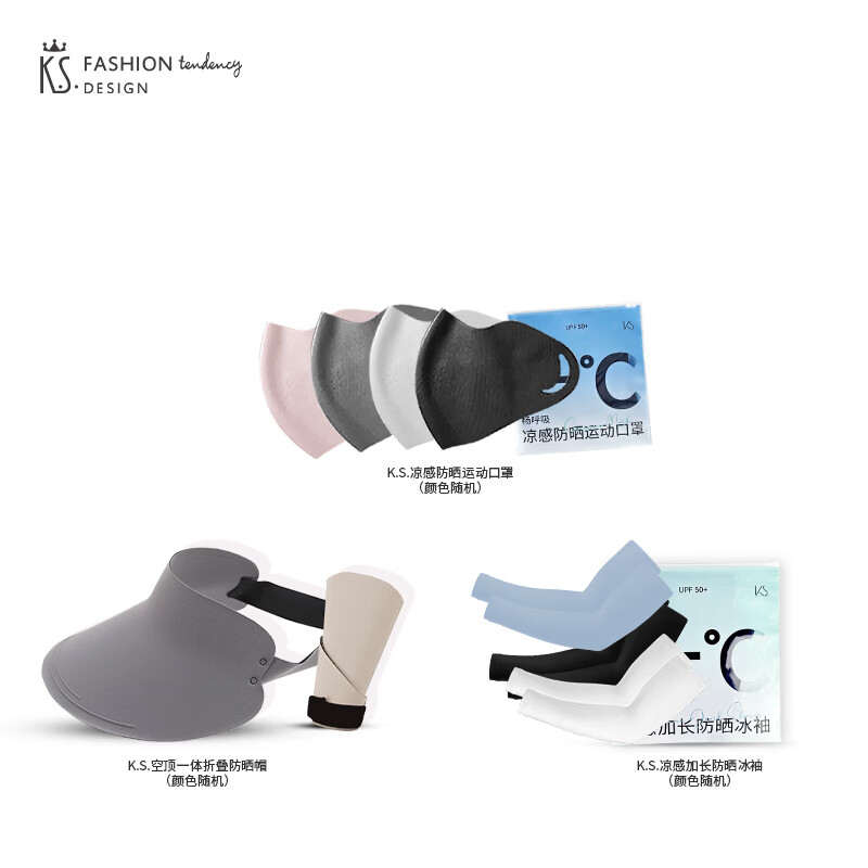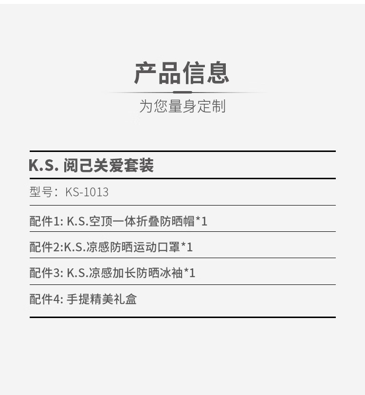 礼盒配置 1.K.S.空顶一体折叠防晒帽*1 2. K.S.凉感防晒运动口罩(KS-1093)*1 3. K.S.凉感加长高弹防晒冰袖*1 4. 手提礼盒*1 彩盒尺寸: 145*75*235mm 装 箱数:48pcs