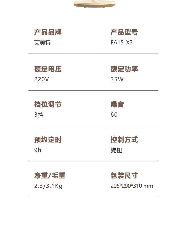 额定电压:220V 额定频率:50HZ 额定功率:35W 档位调节:12档 控制方式:遥控 产品毛重:3.1kg 产品净重:2.3kg 包装尺寸:295*290*310 mm 条 形 码:6914621256668