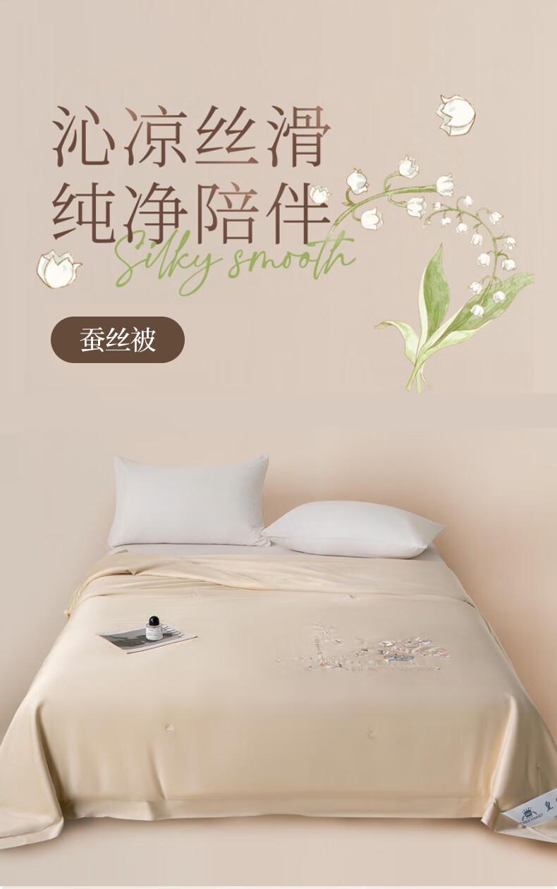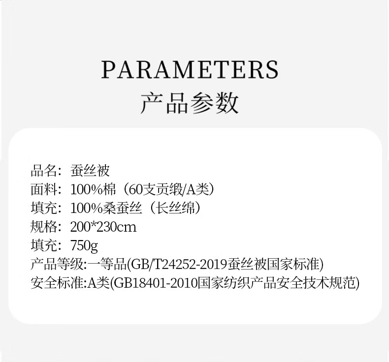 面 料: 100 %莱赛尔 填 充: 100 %蚕丝(长丝) 规 格: 200*230cm 填充重量: 500g 包 装: 皮包