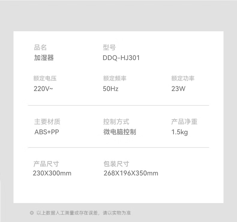 额定电压:220V~ 额定频率:50Hz 额定功率:23W 额定容量:4.0L 控制方式:微电脑程序控制 主要材质:ABS+PP 产品净重:约1.5kg 产品尺寸:230*162*298mm 产品条码:6952020907323 装 箱 数:1台/箱-彩盒+邮购盒