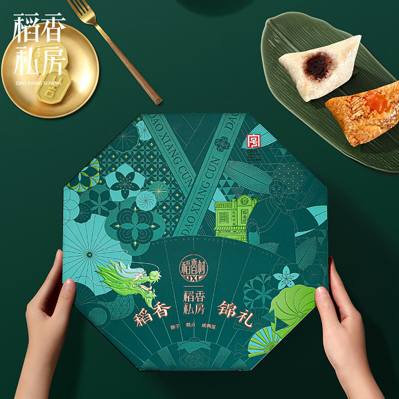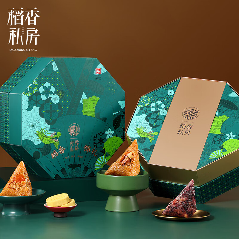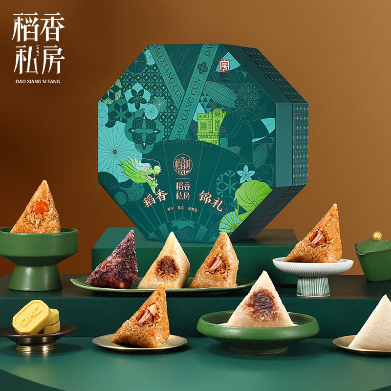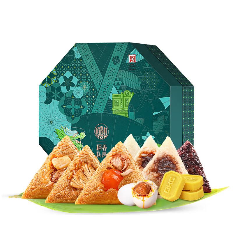 蛋黄鲜肉粽 120g*1枚; 干贝鲜肉粽 120g*1枚 经典鲜肉粽 120g*1枚; 黑米八宝粽 120g*1枚 润香豆沙粽 120g*2枚; 细沙枣泥粽 120g*2枚 清香原味粽 120g*2枚 绿豆冰糕 120g*1盒; 咸鸭蛋 240g*1盒