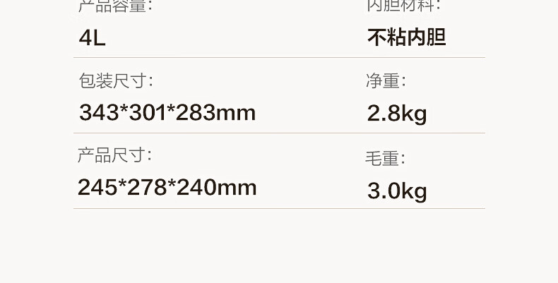 材质 – 不粘内胆 规格:4L/700W 内箱 –343x301x283mm 外箱 - 343x301x283mm 装 箱数 - 1pcs/箱 净重 – 2.8 kg