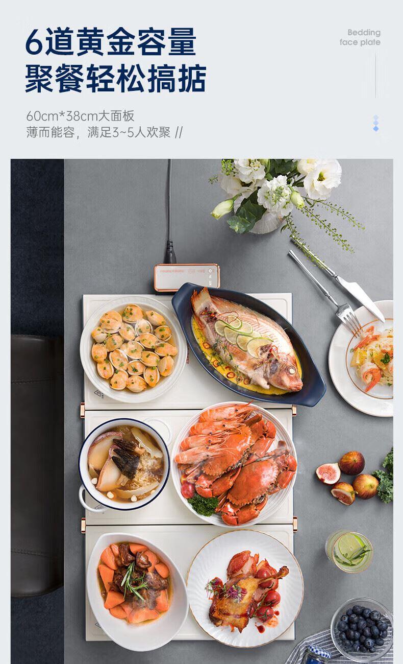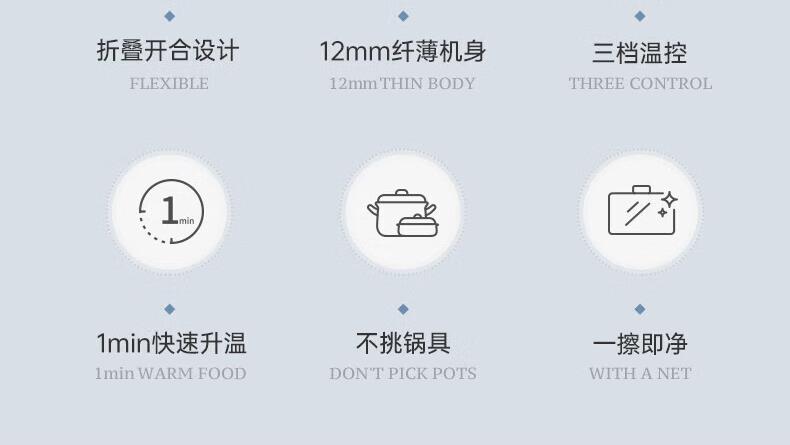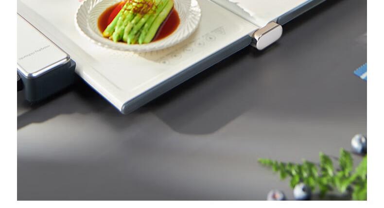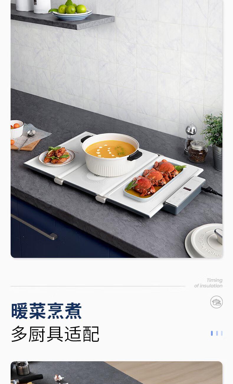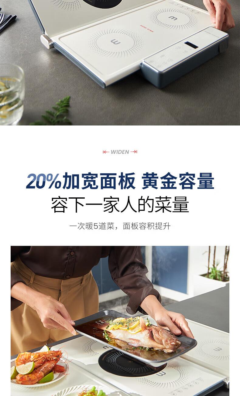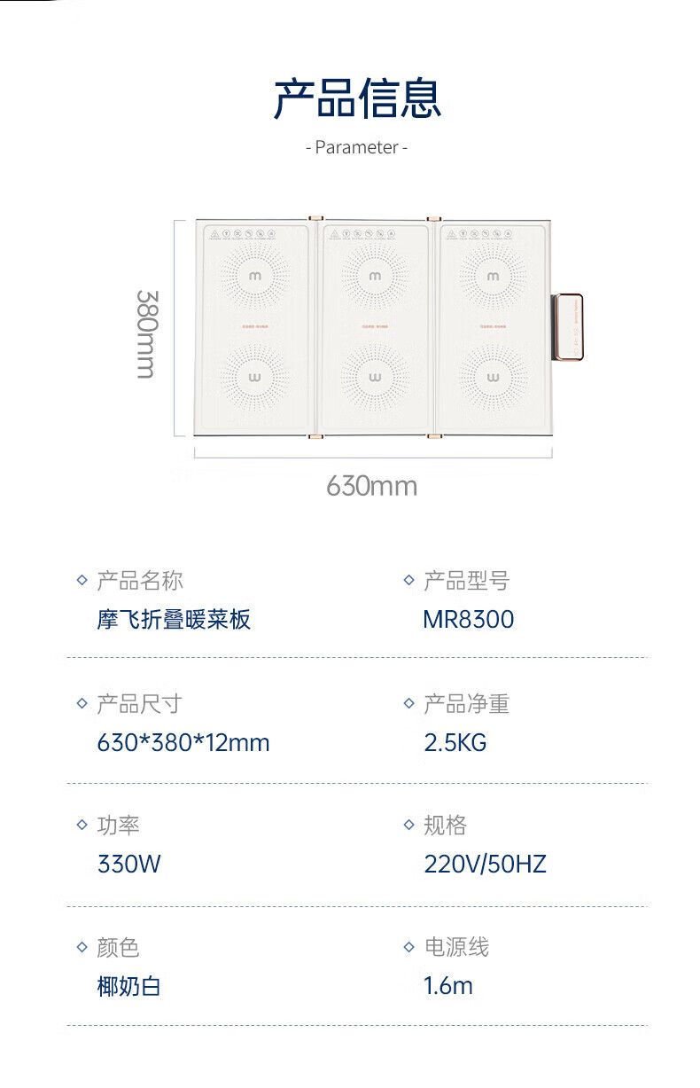 功率:330W 重量:4.35kg 装 箱数:1台 /箱 产品尺寸: 630*380*12 外箱尺寸: 483*146*390 颜色:白色 1、折叠设计,可拆电源线 2、智能触控显示温度,三段调温暖菜 3、六盘容量,三板一抹全干净 4、2.5kg轻巧,智能定时保温 5、可暖各种容器,1分钟全盘速热