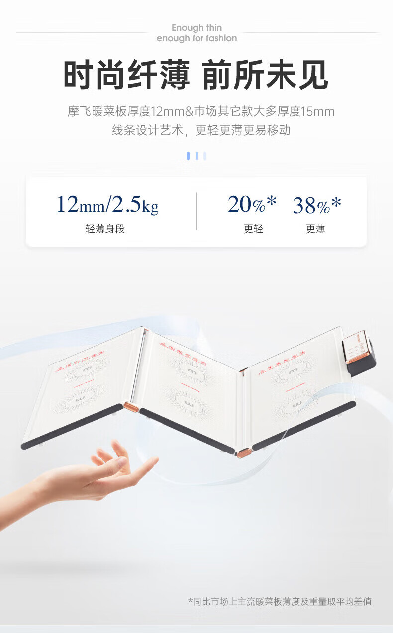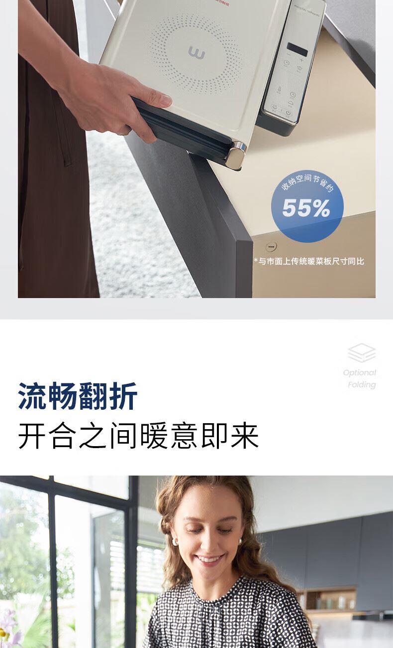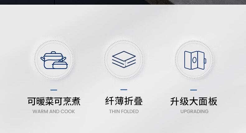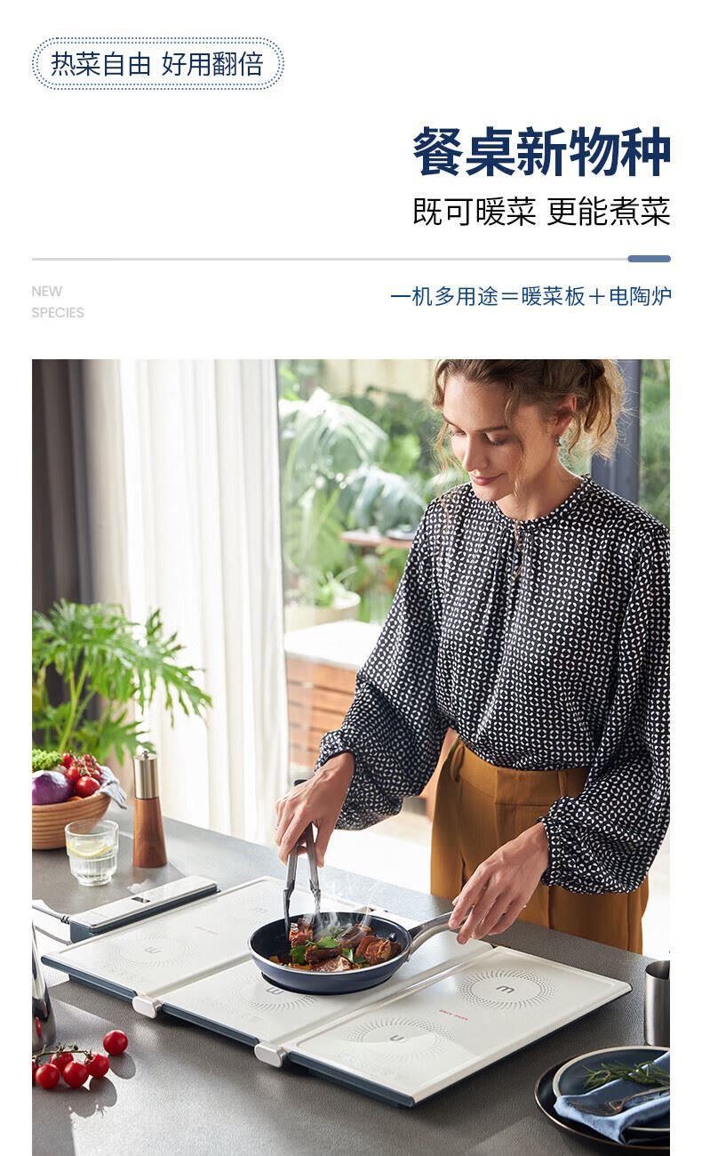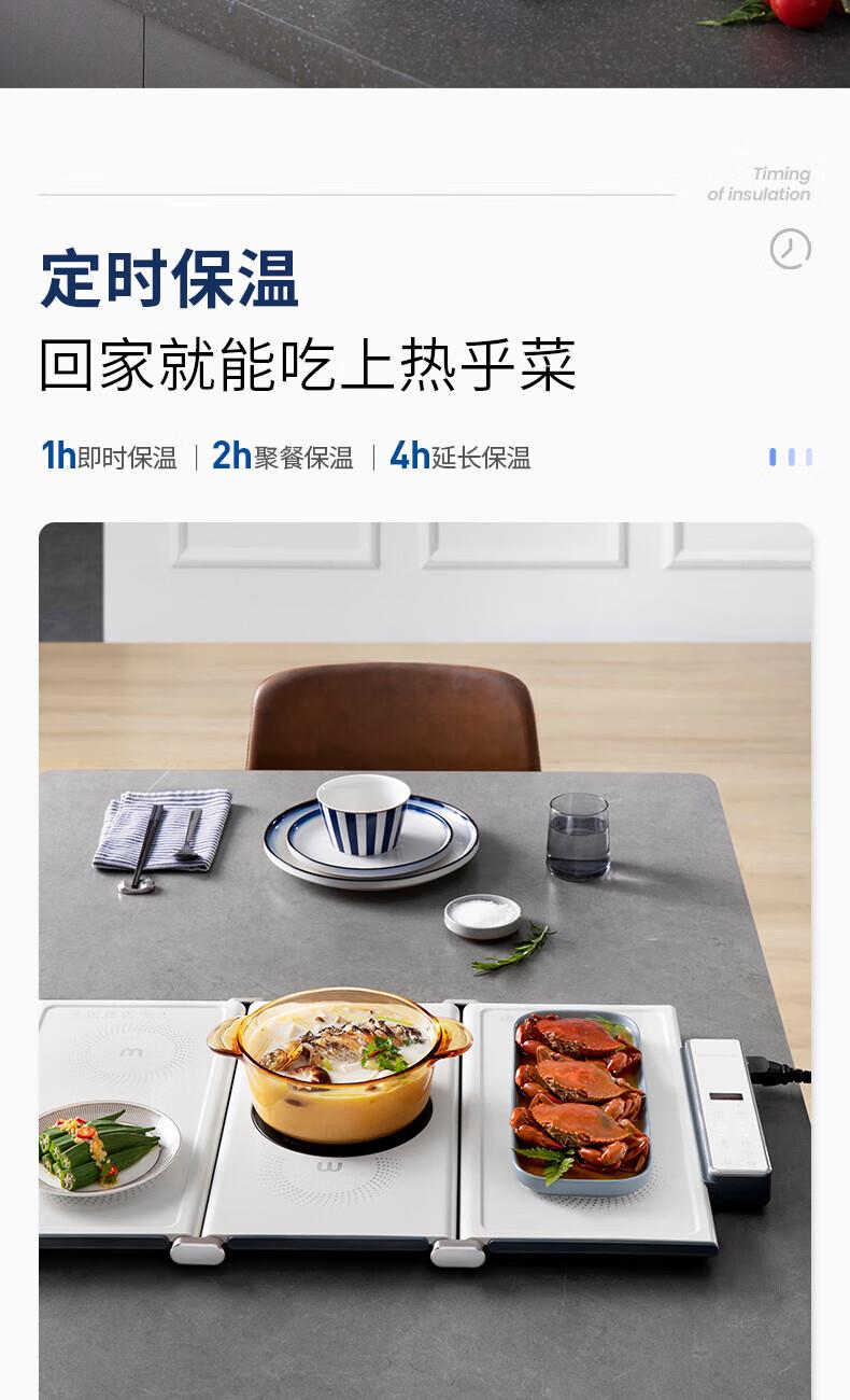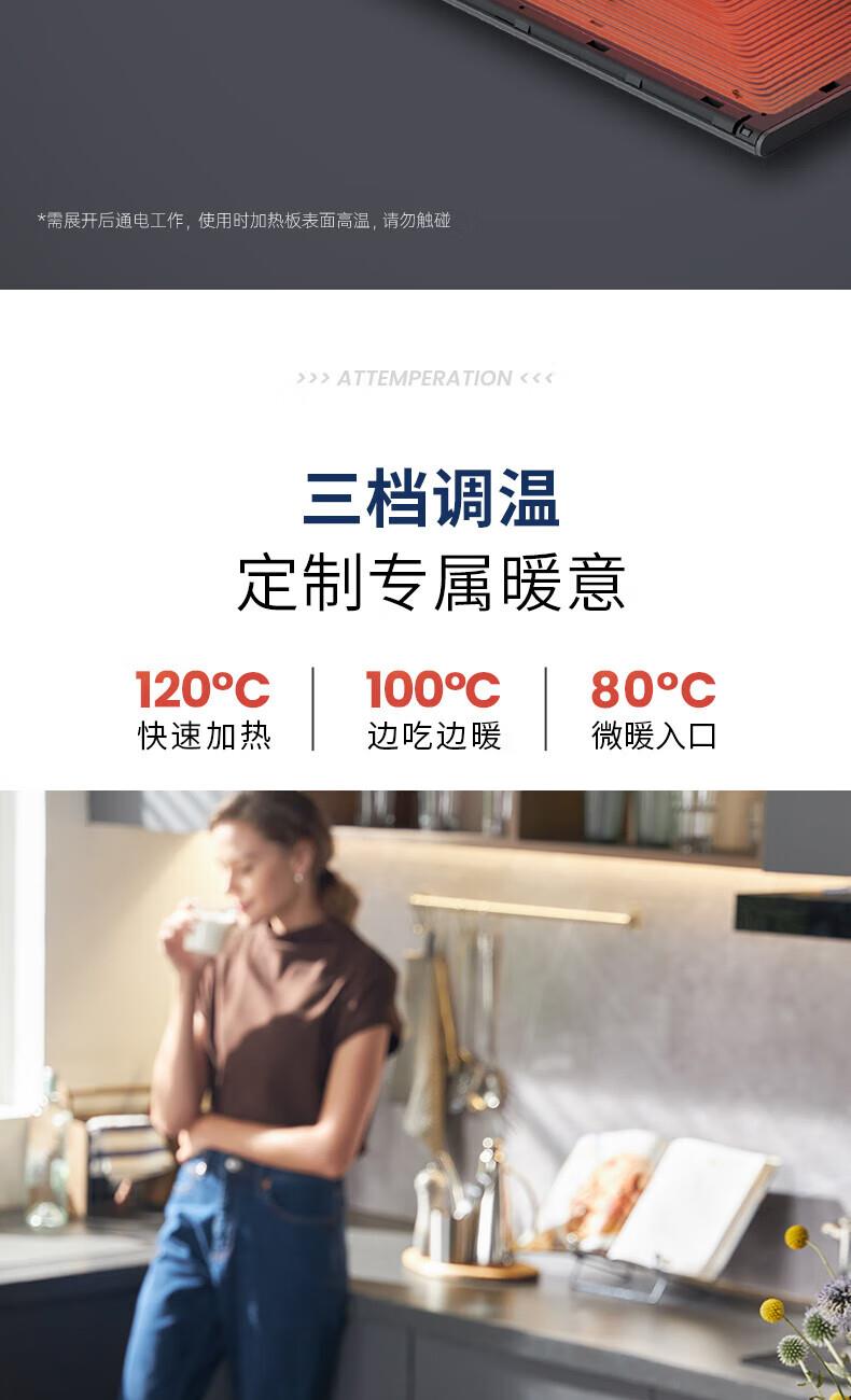 功率:330W 重量:4.35kg 装 箱数:1台 /箱 产品尺寸: 630*380*12 外箱尺寸: 483*146*390 颜色:白色 1、折叠设计,可拆电源线 2、智能触控显示温度,三段调温暖菜 3、六盘容量,三板一抹全干净 4、2.5kg轻巧,智能定时保温 5、可暖各种容器,1分钟全盘速热