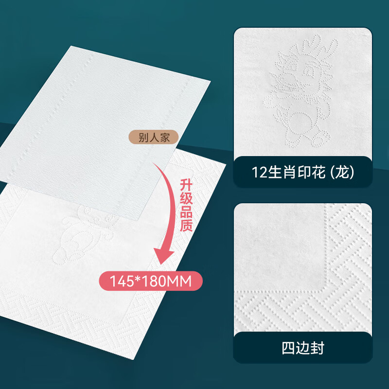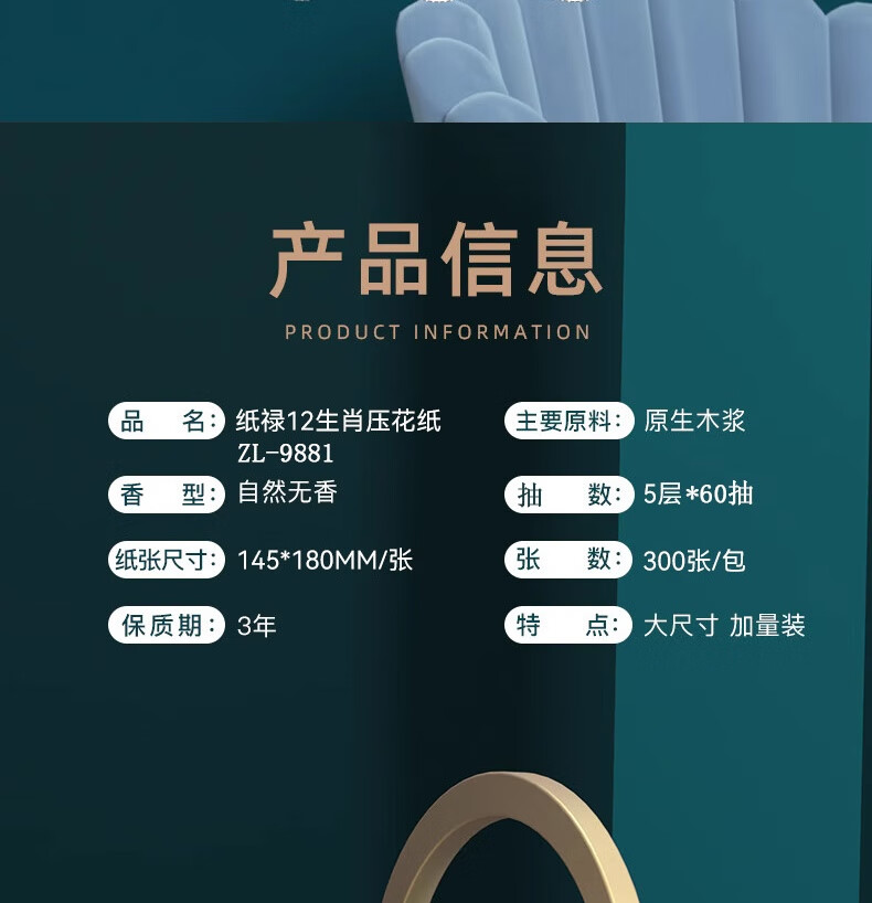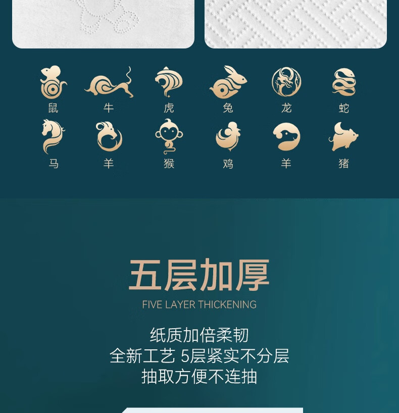 产品 名 称:12生肖抽纸 主要成分:原生木浆 成品尺寸:14.5*9*6cm 装 箱 数:20包 /箱 内装纸张数:300张5层 箱子尺寸:29*19*30cm 内装纸尺寸:145*180mm 箱 装 重量:2.5kg/箱