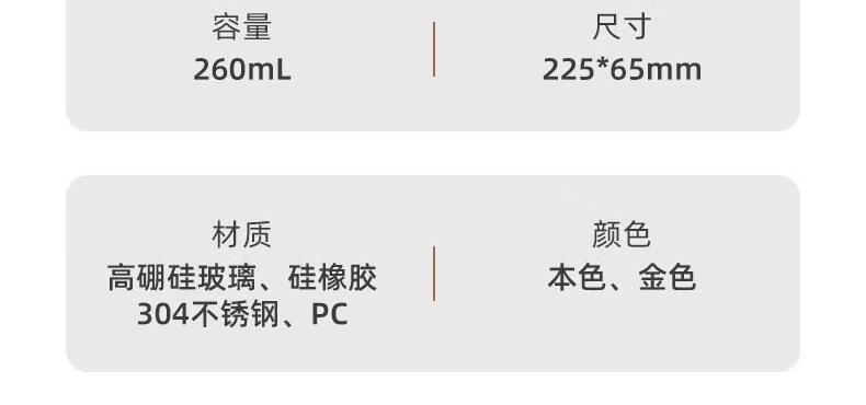 容量:260ml 颜色: 本色、 金色 包装形式:礼盒 装 箱数:20只 /箱