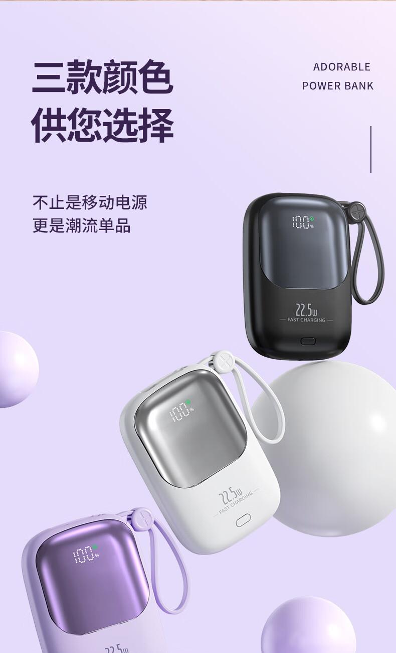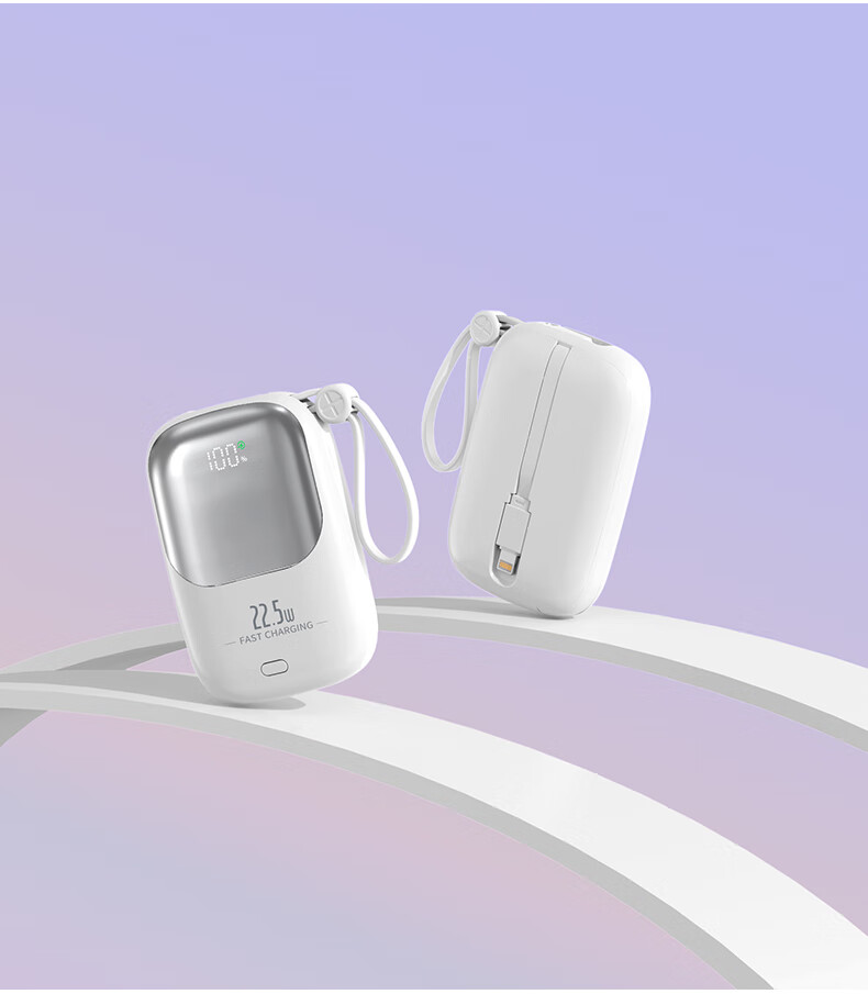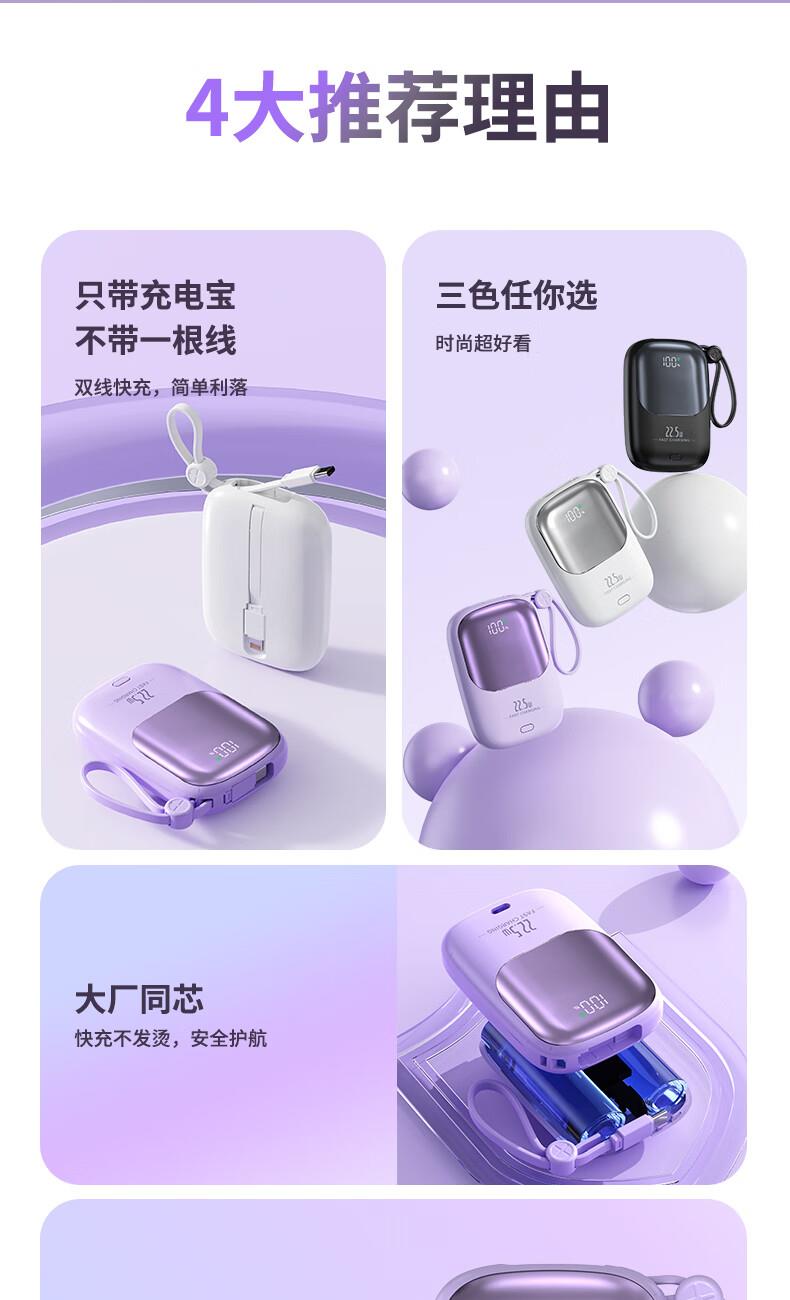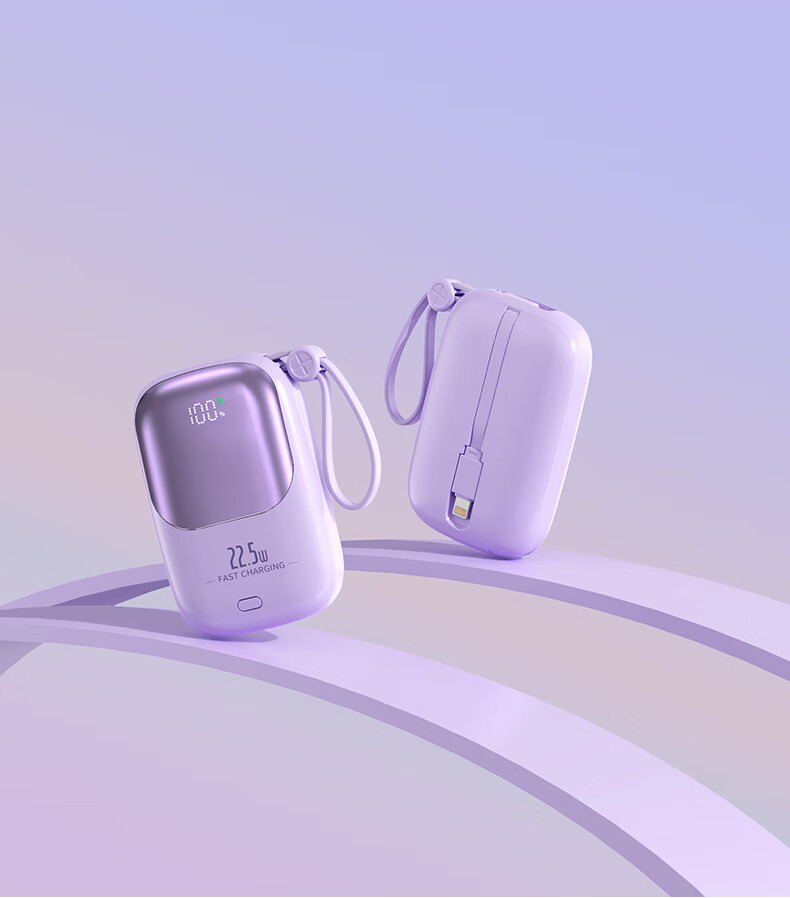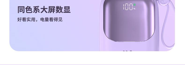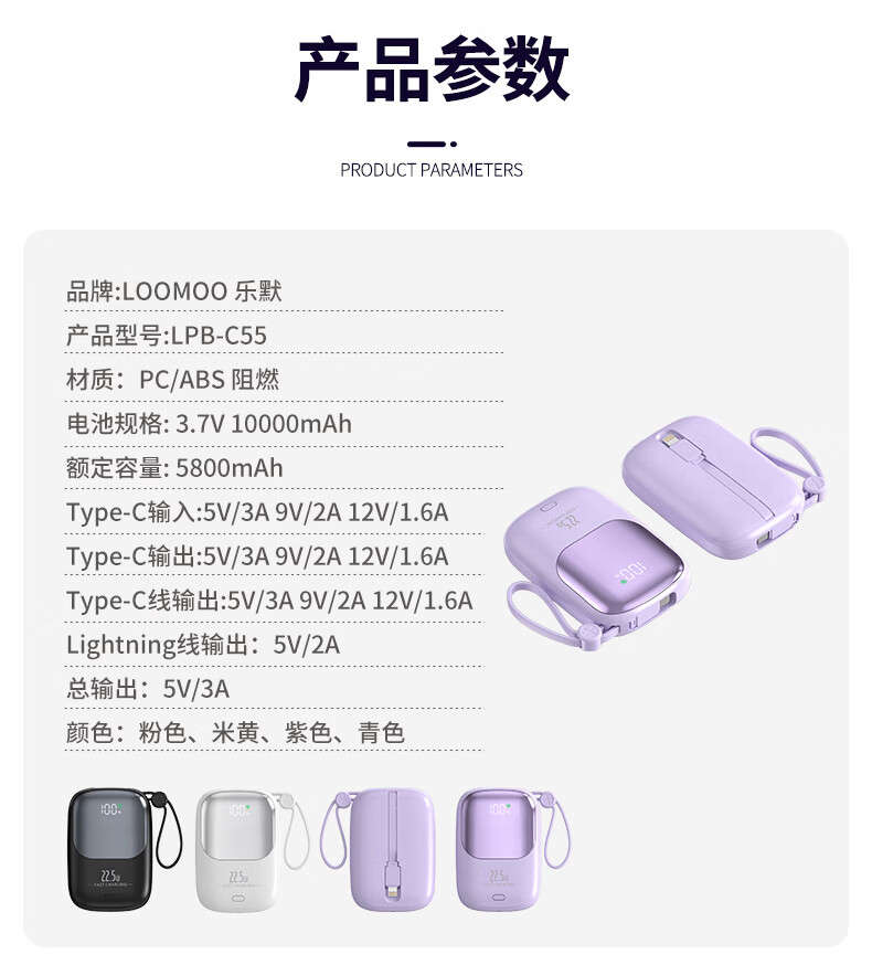 产品型号:LPB-C55 颜 色: 紫色、黑色、白色 材质:ABS+PC 电芯容量:10000毫安 电芯型号:21700*2 输入:Type-C输入:5V3A9V2A12V1.5A 输出:Type-C输出:5V/3A9V2.2A12V1.6A Lightning输出:5V/2.4A9V22A12V1.5A 京东链接:https://item.jd.com/10115157895114.html 69码:6972991656570