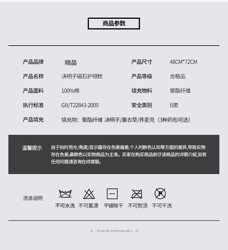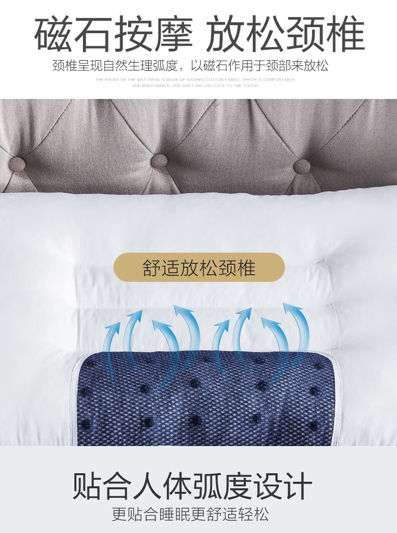 面 料: 亲肤棉 填 充: 决明子+磁石+羽丝绒 规 格: 48*74cm 包 装:无纺布包