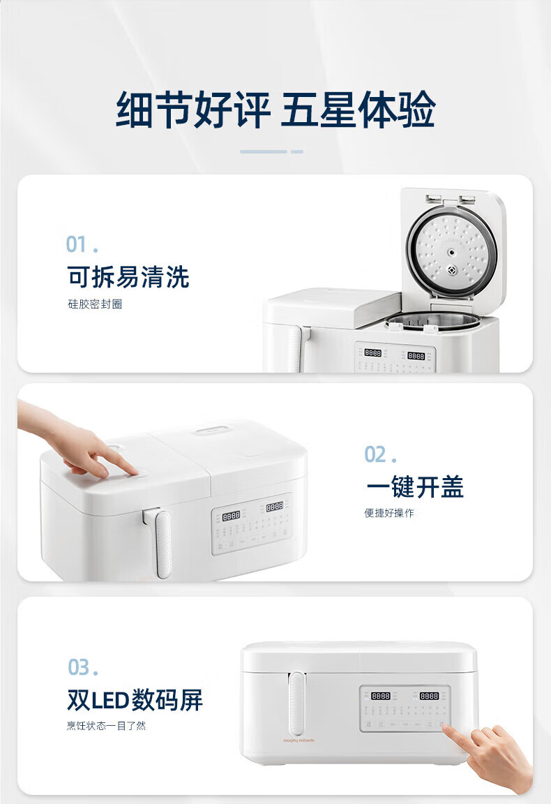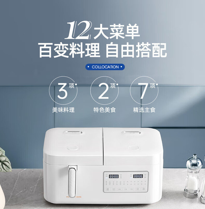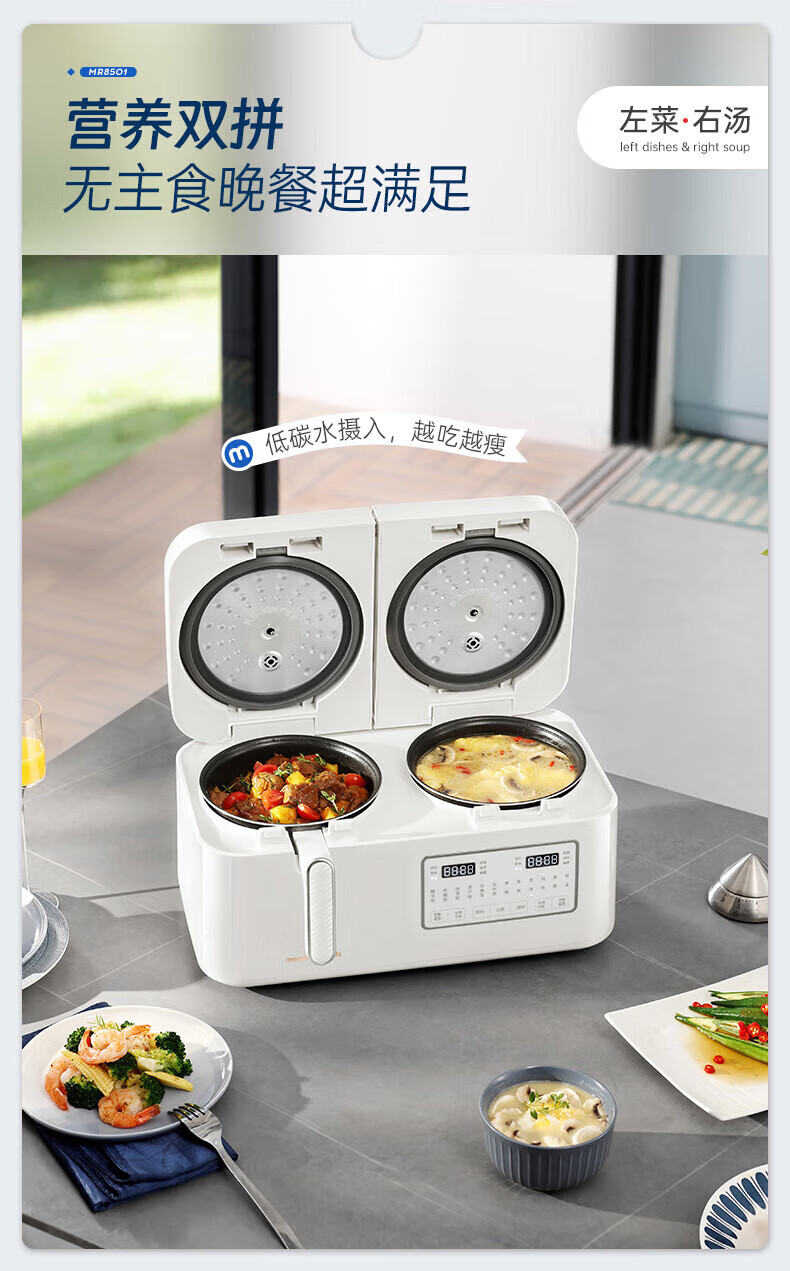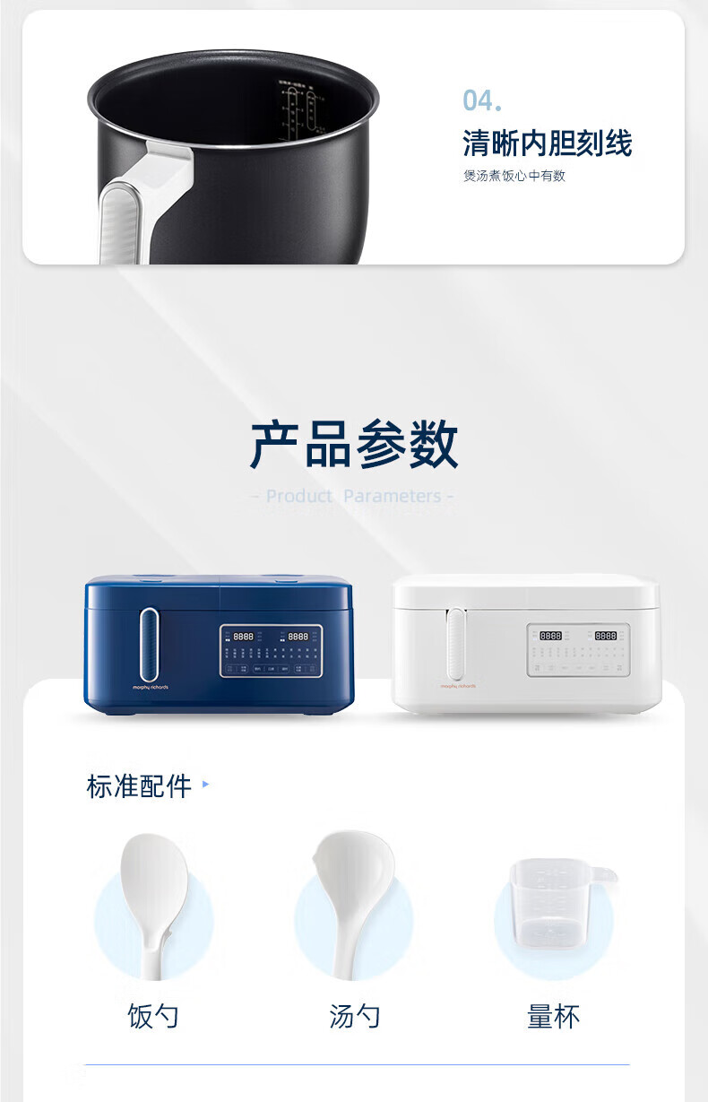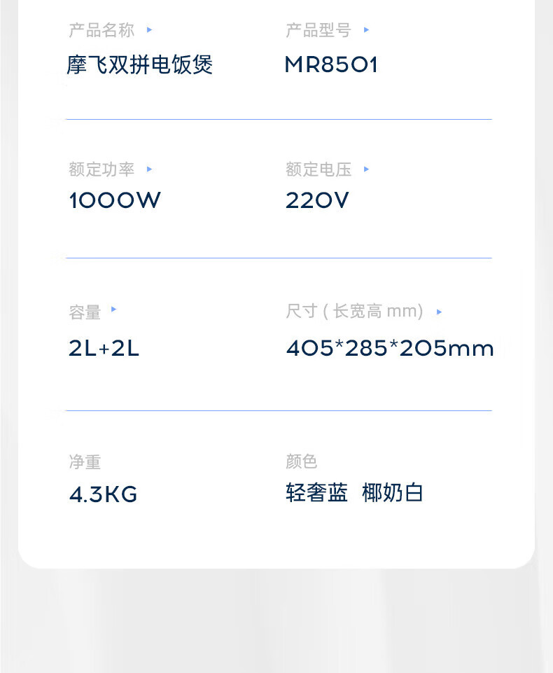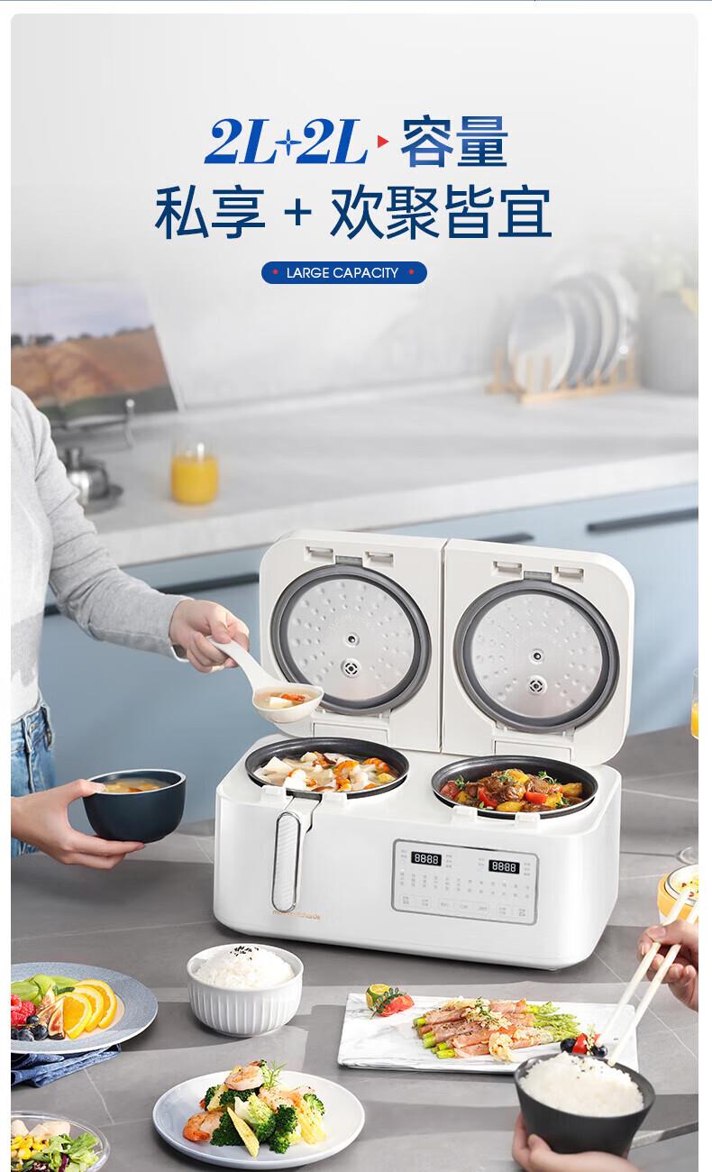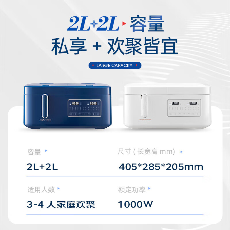 率:1000W(单锅500W) 重量:4.3kg 装 箱数:1台 /箱 容量:4L(2L+2L) 产品尺寸:405*285*205 外箱尺寸: 486*358*274 颜色:白色、蓝色