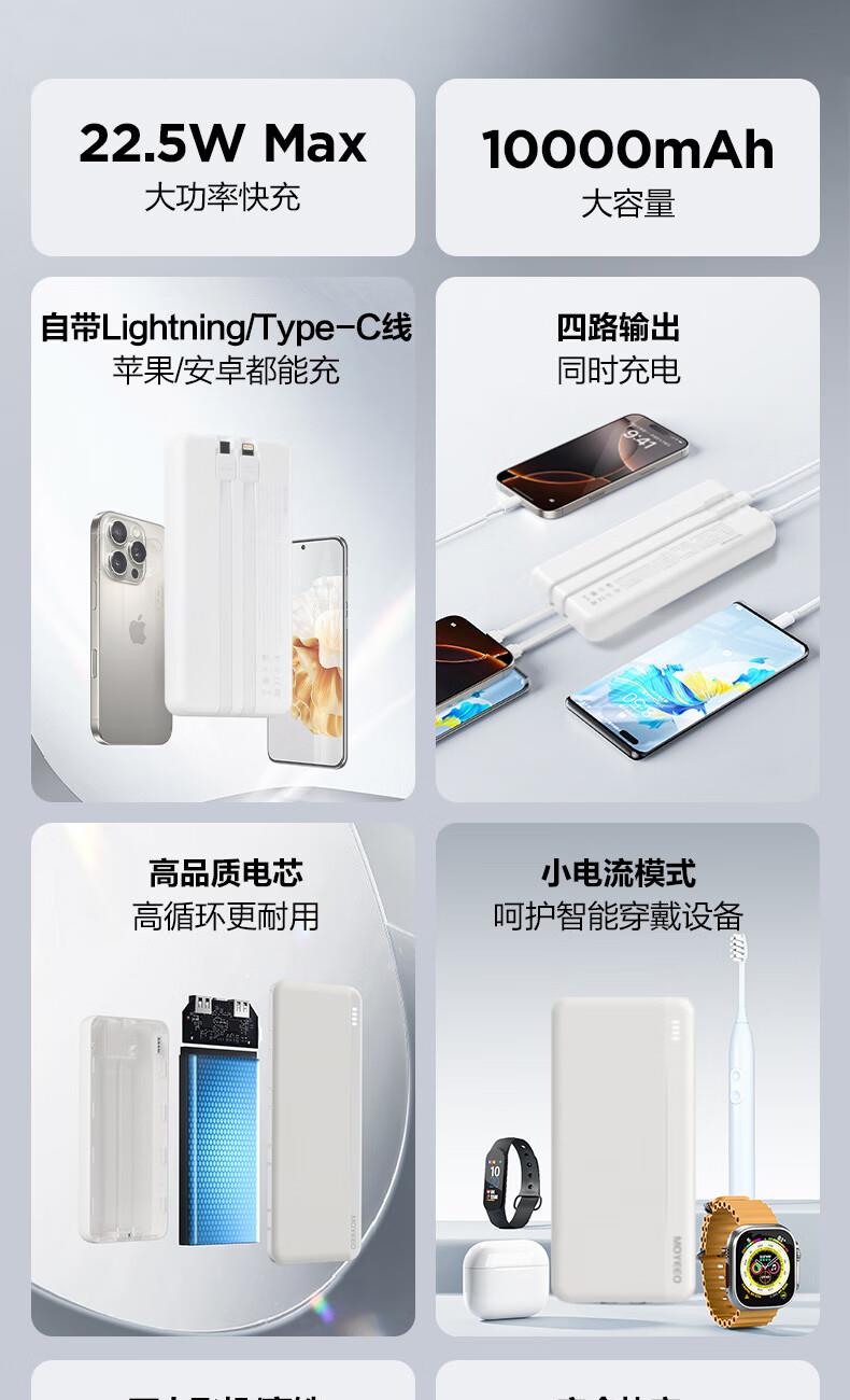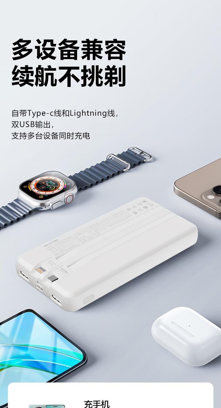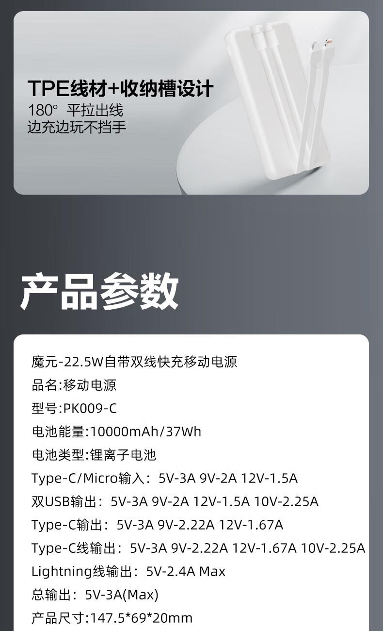 型号:PK009C-1 容量:10000mAh(37Wh) 颜色:优雅白(黑色1000起订) 材质:ABS防火料 产品尺寸:141*68*16mm 包装尺寸:168*103*36mm 单个重量:270g