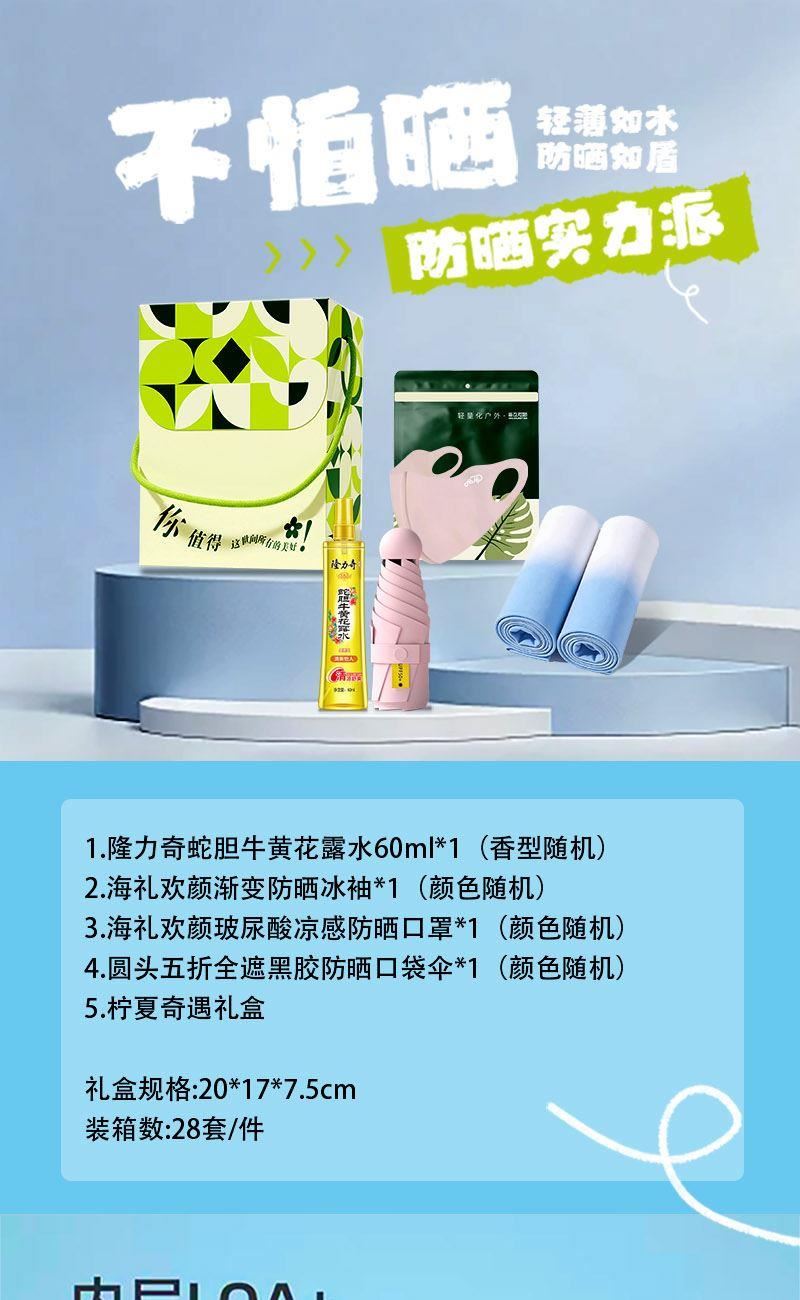 装 箱数:28 1.隆力奇蛇胆牛黄花露水60ml*1(香型随机)2.海礼欢颜渐变防晒冰袖*1(颜色随机)3.海礼欢颜玻尿酸凉感防晒口罩*1(颜色随机)4.圆头五折全遮黑胶防晒口袋伞*1(颜色随机)5.柠夏奇遇礼盒