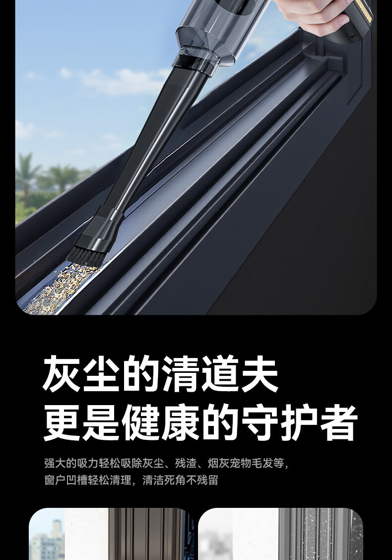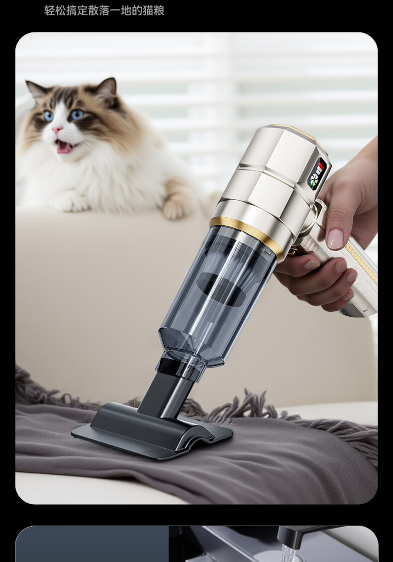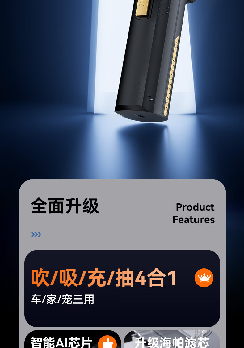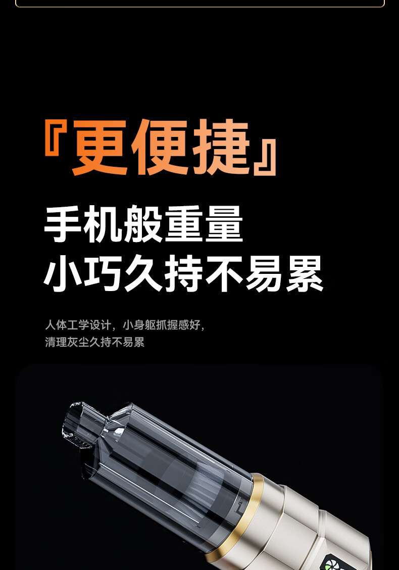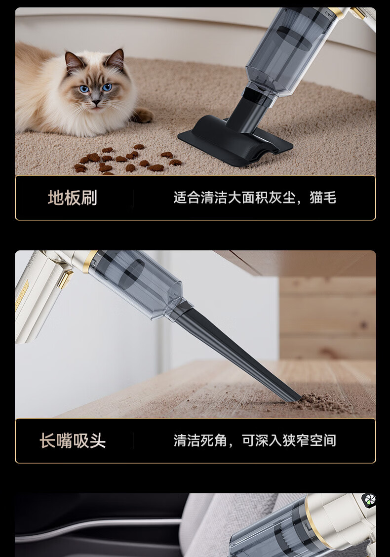 产品型号 006 版本 有刷头 档位 3 供电方式 TYPE-C 电压 11.1V 35W/40W/100W 吸力 18000Pa/12000PA/7000Pa 额定功率 100W-120W 放电时间 12mins 18mins/30mins 电池容量 18650*3*2000mAh 尘仓容量 200ml 产品材质 塑料 ABS 海帕:ABS+PVC+聚酯热轧布 产品颜色 亚黑+金色 银色+金色 产品尺寸 225*190*70mm 产品净重 0.442kg