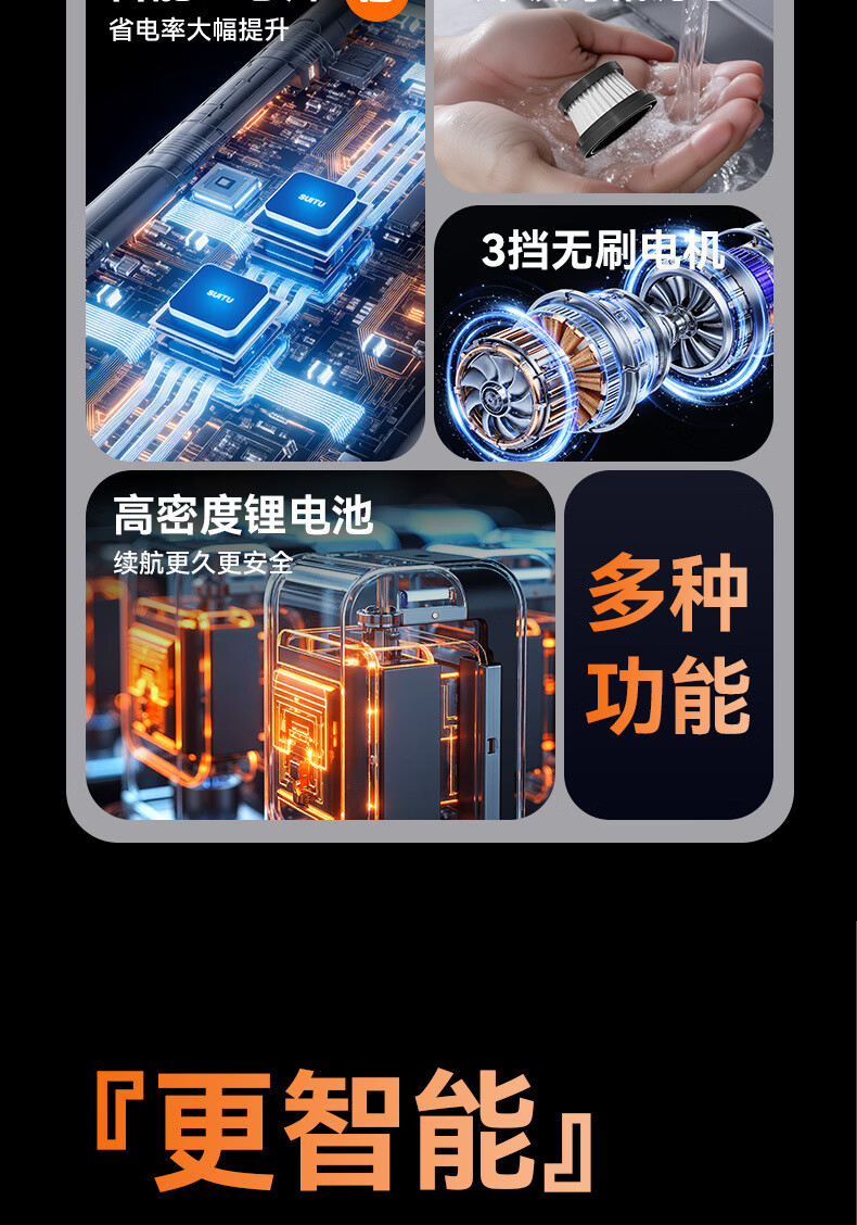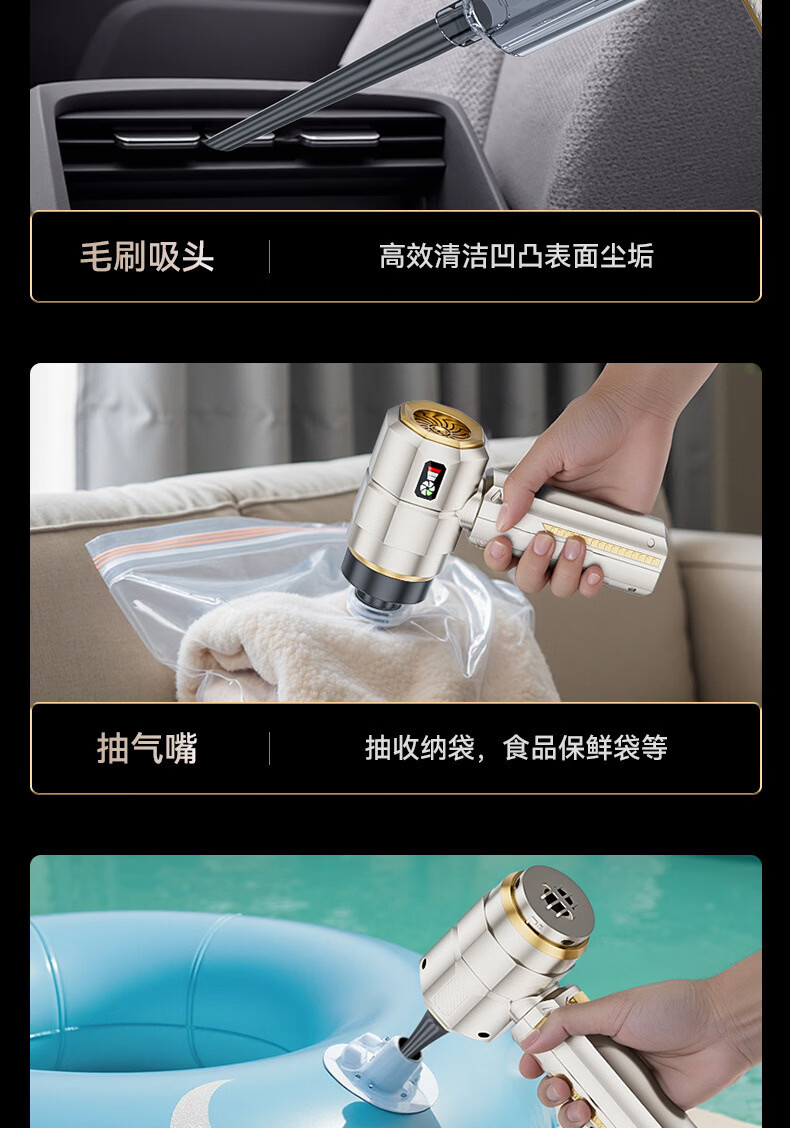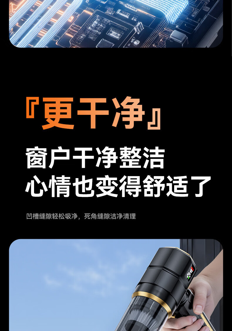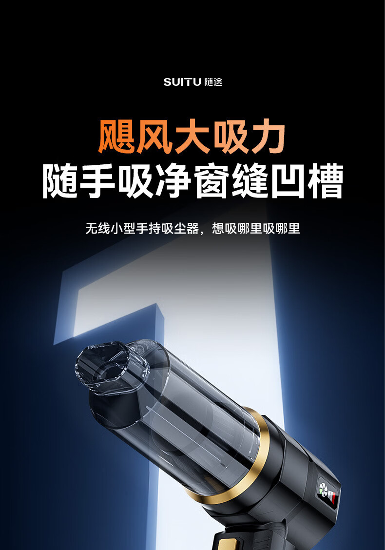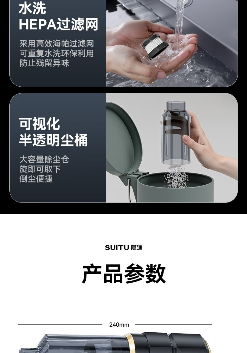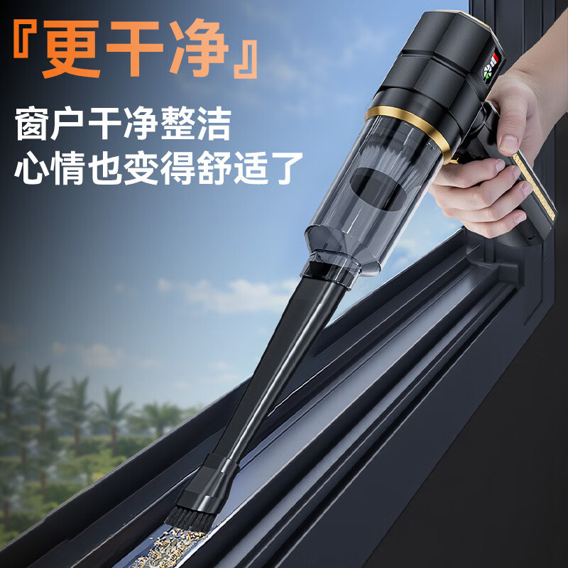 产品型号 006 版本 有刷头 档位 3 供电方式 TYPE-C 电压 11.1V 35W/40W/100W 吸力 18000Pa/12000PA/7000Pa 额定功率 100W-120W 放电时间 12mins 18mins/30mins 电池容量 18650*3*2000mAh 尘仓容量 200ml 产品材质 塑料 ABS 海帕:ABS+PVC+聚酯热轧布 产品颜色 亚黑+金色 银色+金色 产品尺寸 225*190*70mm 产品净重 0.442kg