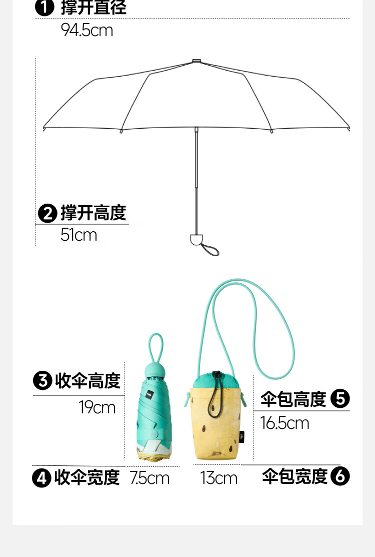 产品尺寸: 撑开直径:94.5cm、收伞宽度:7.5cm 撑开高度:51cm、收伞高度:19cm 箱 规:24支、伞品净重: ≈255g