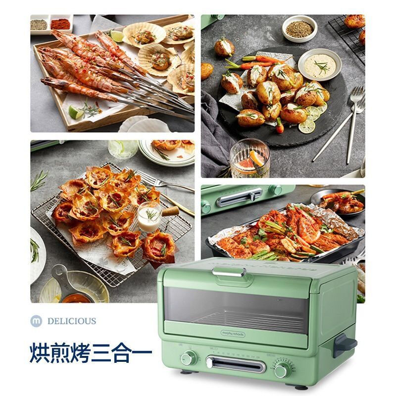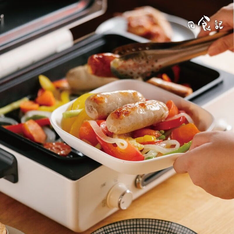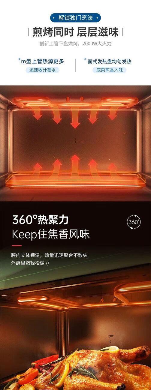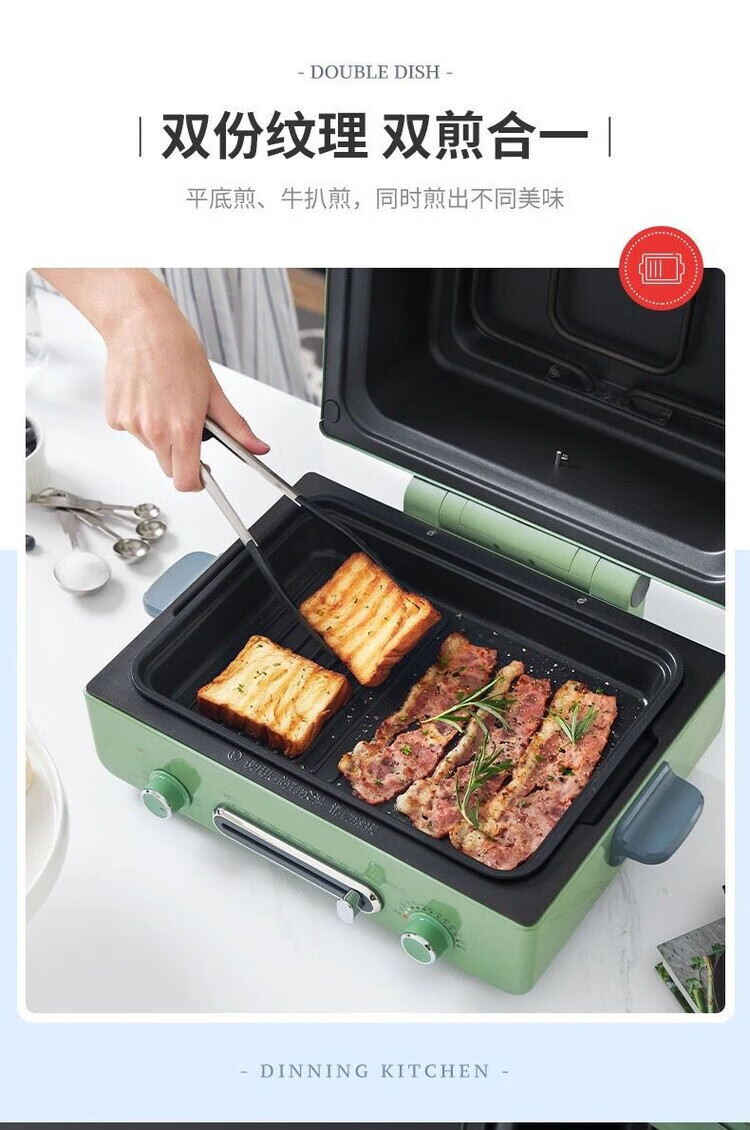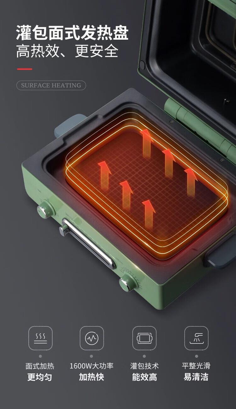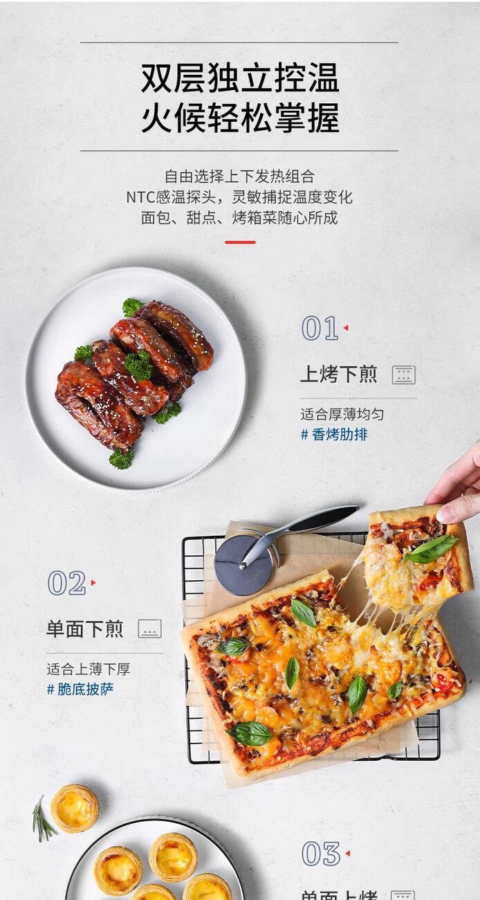 功率:1500W 重量:6.5kg 装 箱数:1台 /箱 产品尺寸: 351*307*299 外箱尺寸: 434*368*487 颜色:白色 1、面式发热盘,均衡高效受热 2、可翻盖的烤箱,内部清洁无死角 3、喷不粘油烤盘,轻油少烟味 4、电子式十档广域控温范围,可调40℃-230℃之间,控温精 准 5、跑马灯酷炫设计,0-60min灵敏定时 6、2000W大功率,高效发热,快速提供热量 7、烘煎烤,一机多用,实时变换