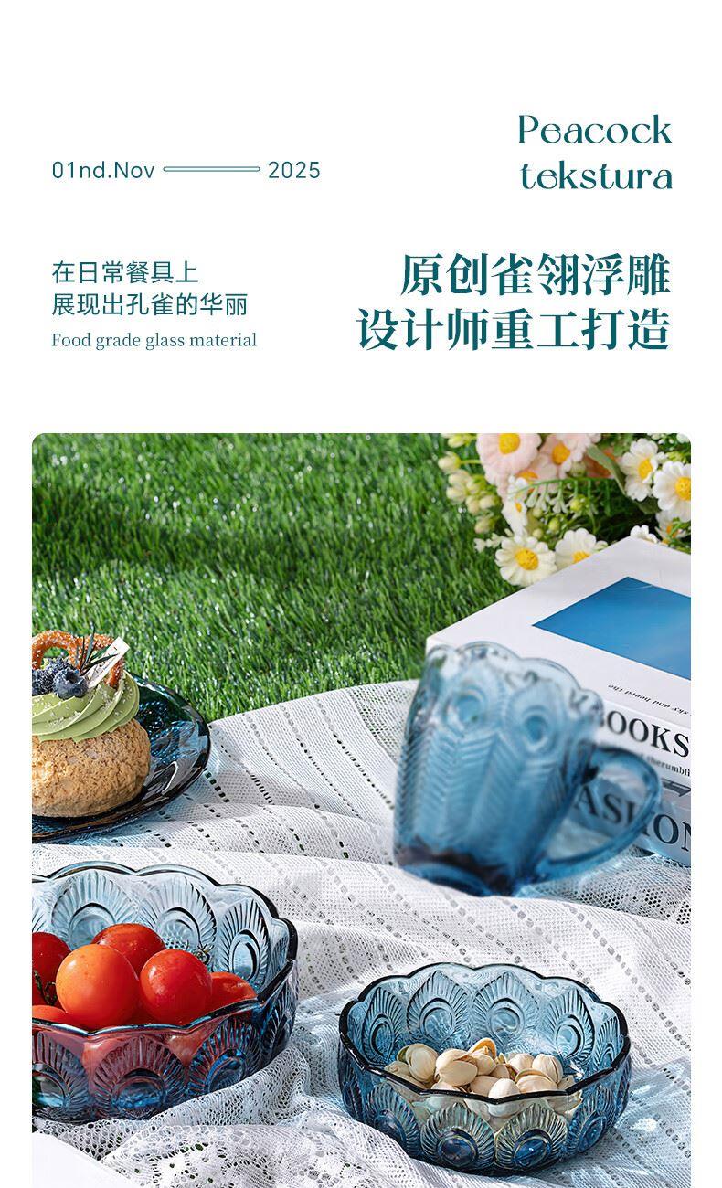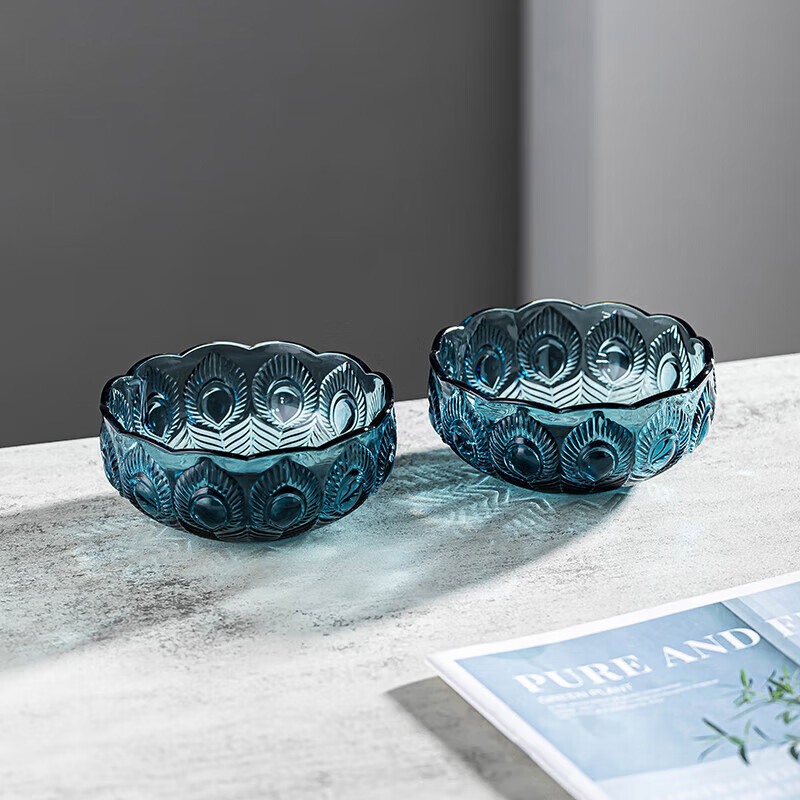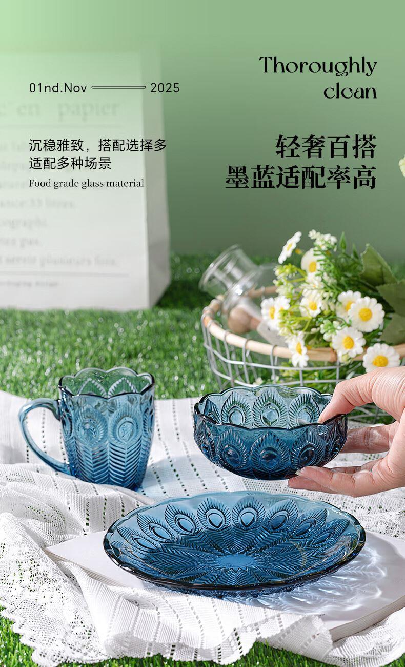 产品材质:钠钙玻璃 产品参数:大碗650ml*1、小碗280ml*4、盘子195mm*1 颜 色:墨蓝色 装 箱毛重:8套 /箱,17.7kg 彩盒尺寸:34.5*11*24.3cm 外箱体积:46*35.5*50cm