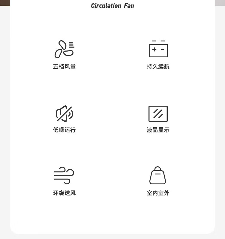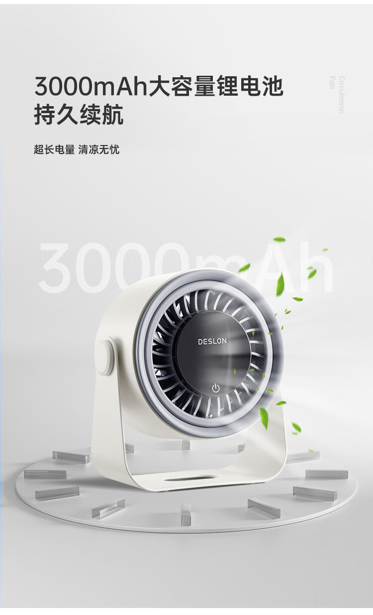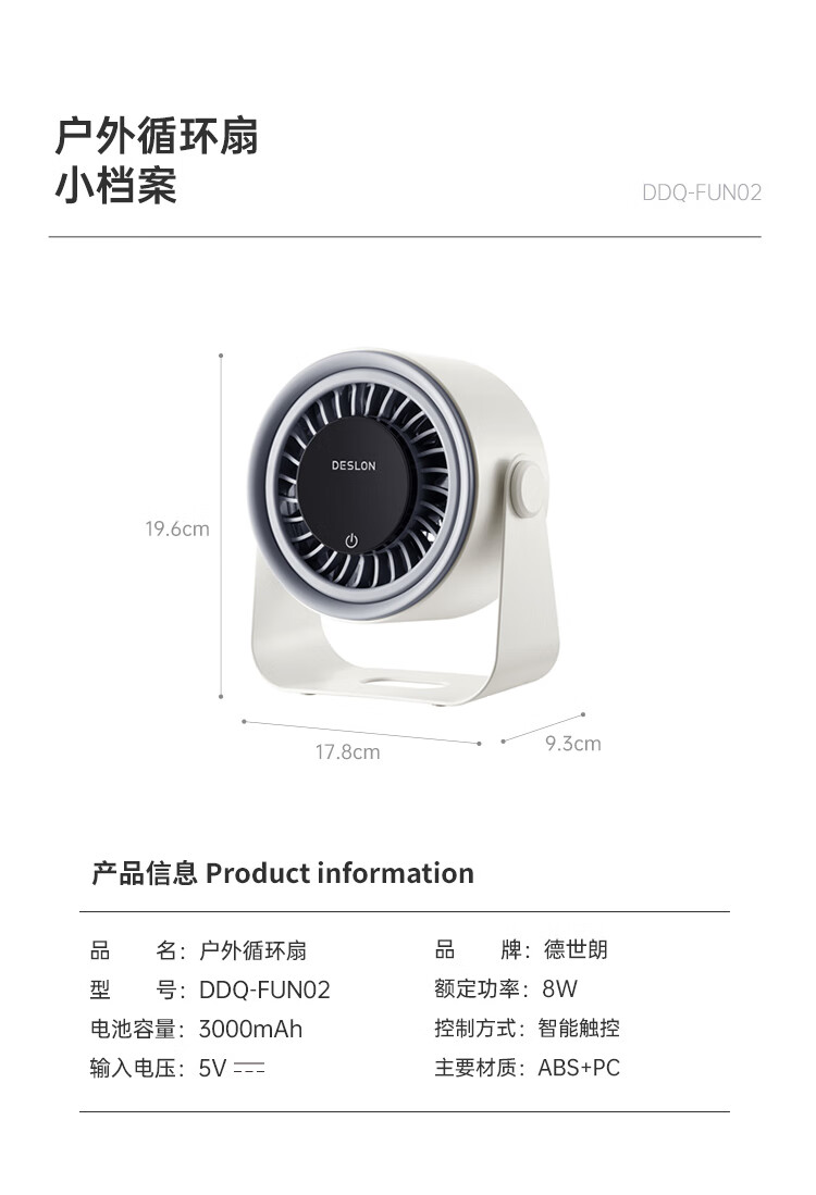 额定电压:5VDC 风罩尺寸:直径约150mm 额定功率:8W 产品尺寸:178*93*196mm 控制方式:智能触控 产品净重:约565g 电池容量:3000mAh 速档位:5档 主要材质:ABS+PC 产品条码:6952020905817 装 箱 数:20台/箱-彩盒+邮购盒+大外箱