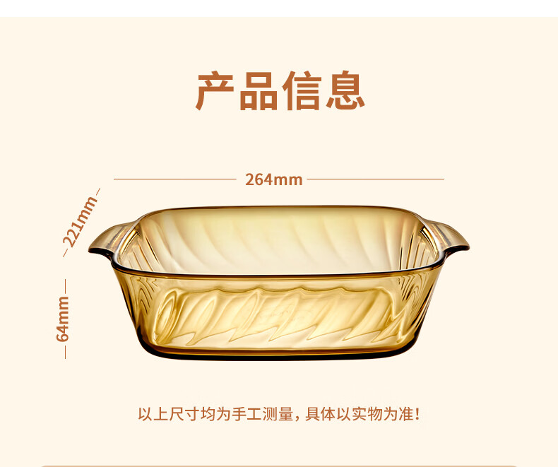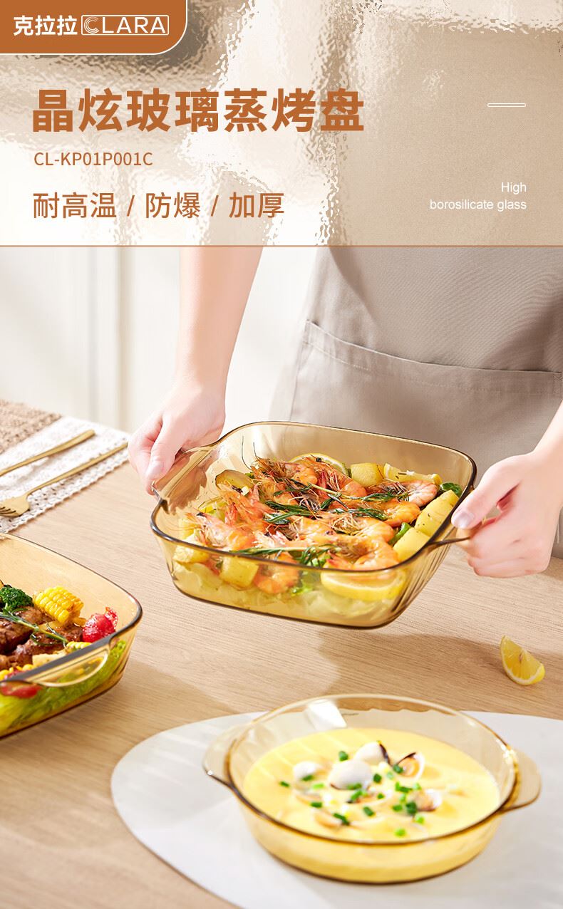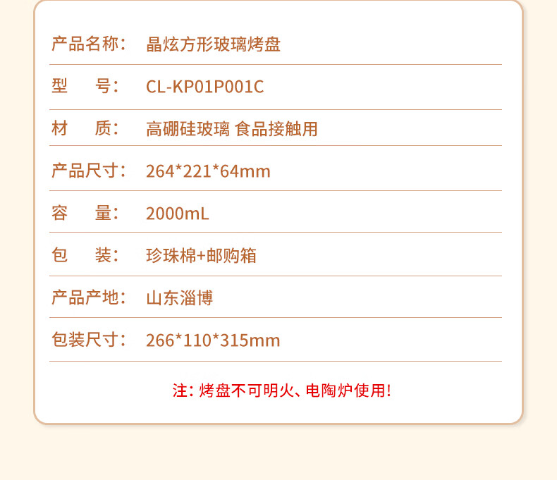 产品型号:CL-KP01P001C 产品材质:高硼硅玻璃 包装方式: 彩盒+邮购盒 条形码:6979489300120 产品尺寸: 长264mm,宽221mm,高64mm 包装尺寸:268*112*319mm 产品净重: 毛重:1.4kg 装 箱数:12套 /箱