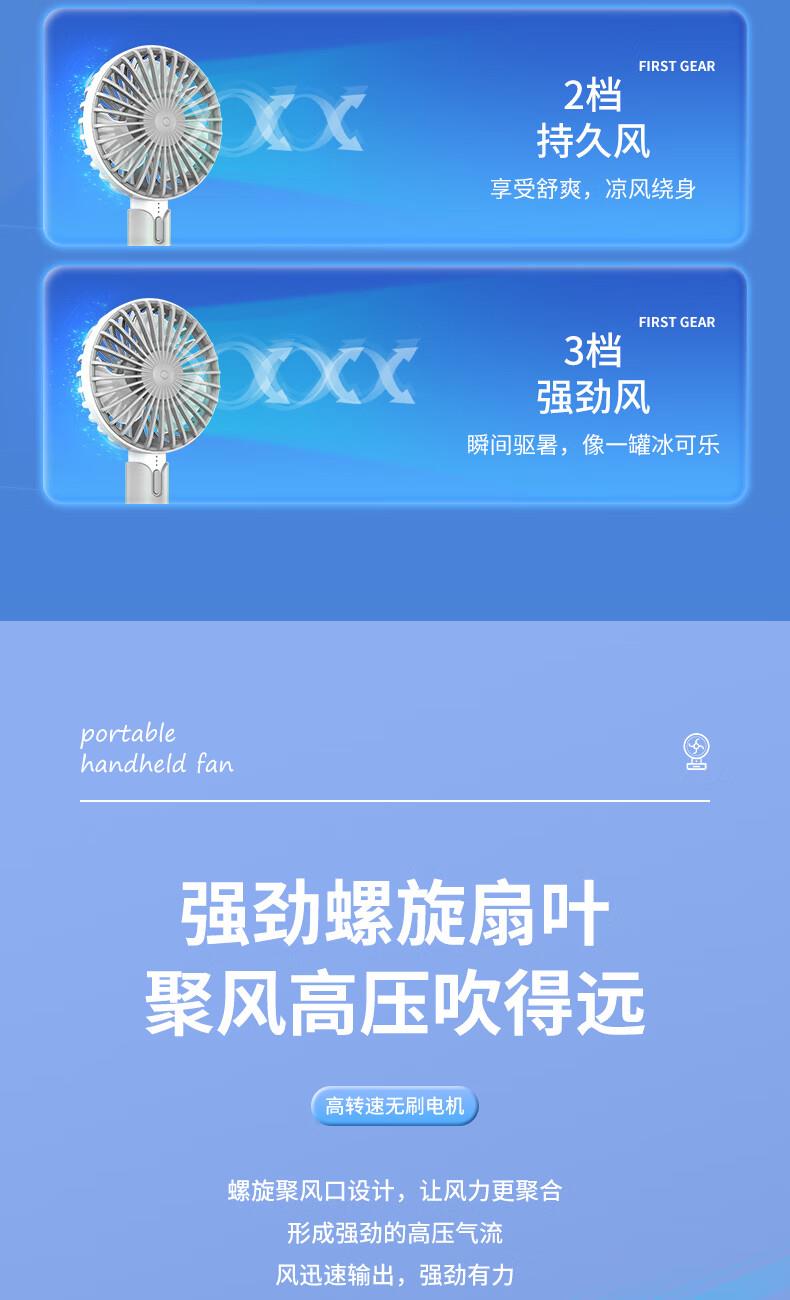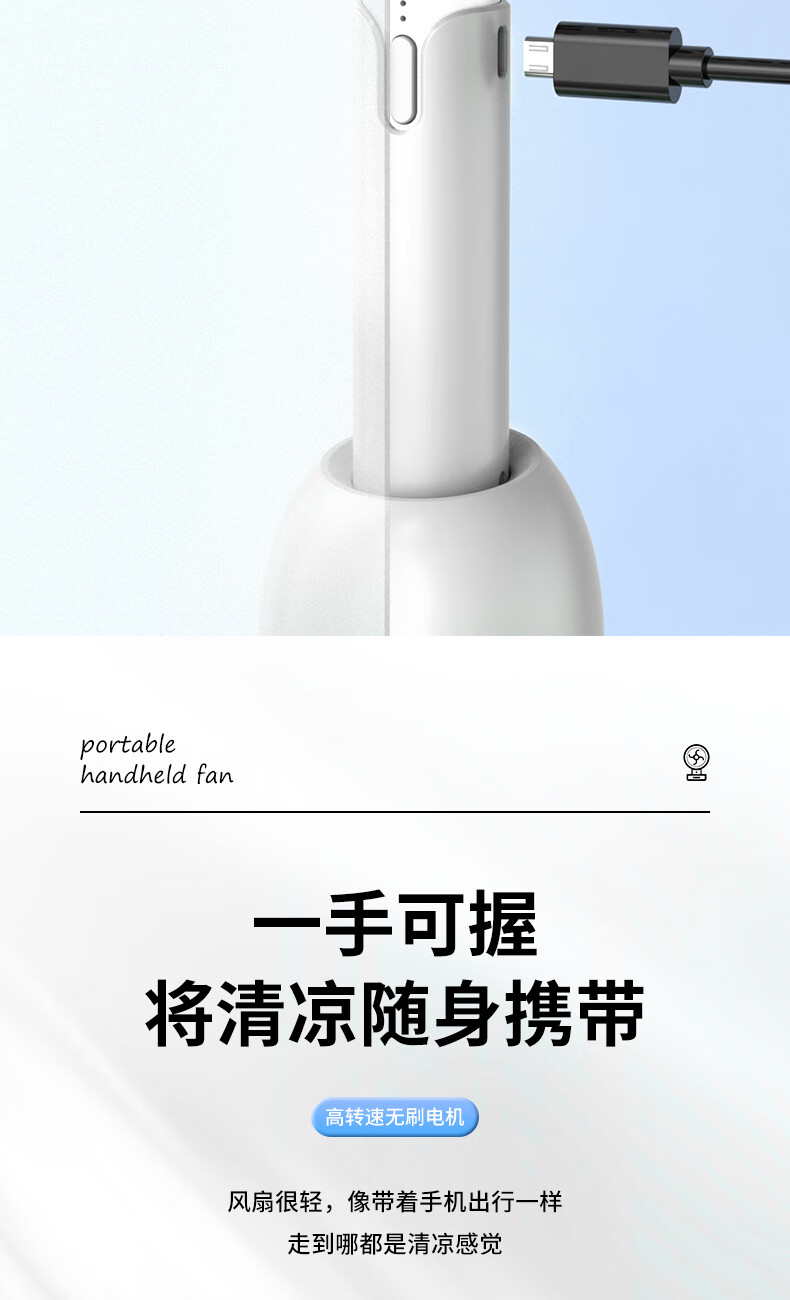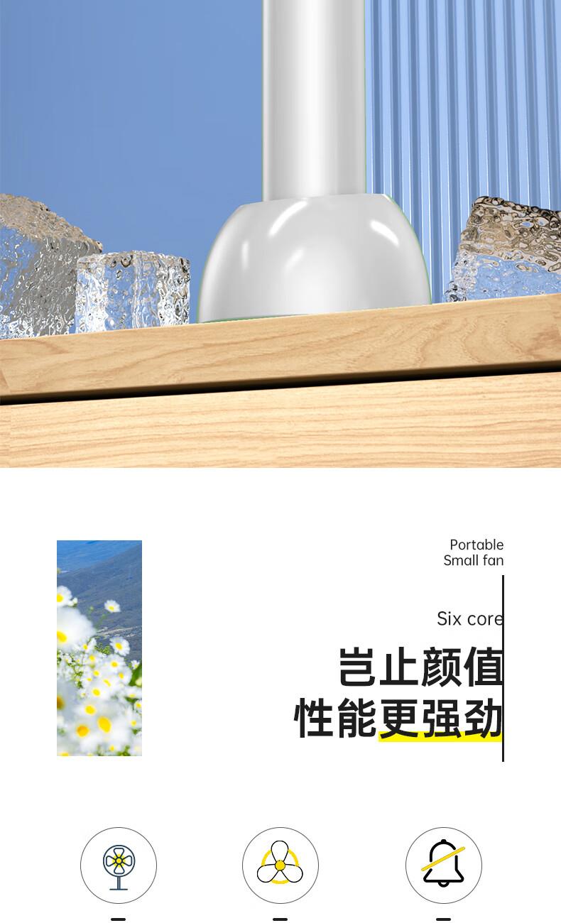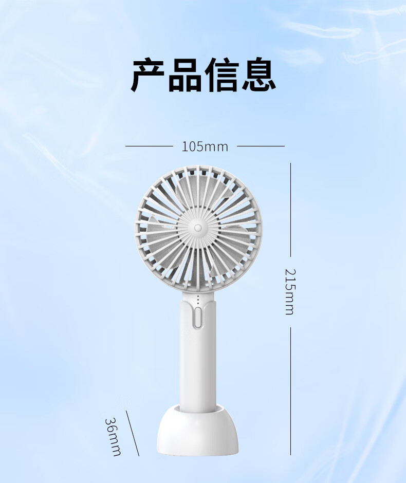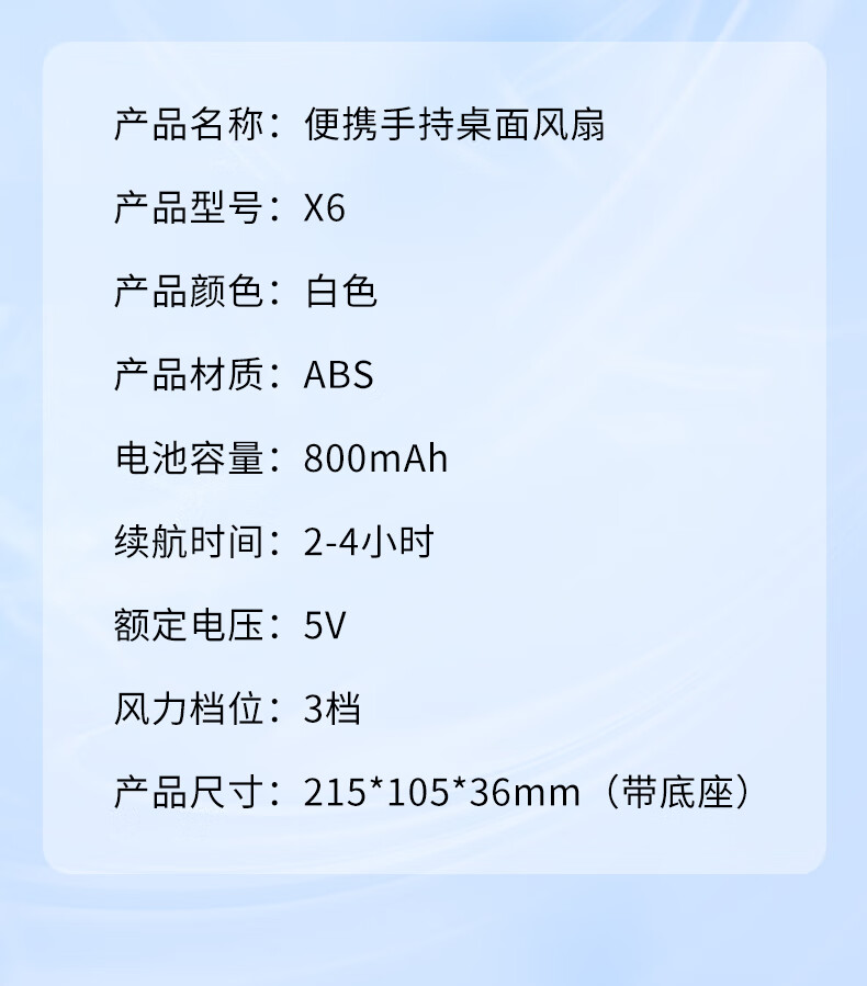 型 号:X6 产品颜色:白色 材 质:ABS 电池容量:800mAh 续航时间:2-4小时 额定电压:5V 风力档位:3档 产品尺寸:215*105*36mm(带底座) 包装尺寸:210*98*37mm