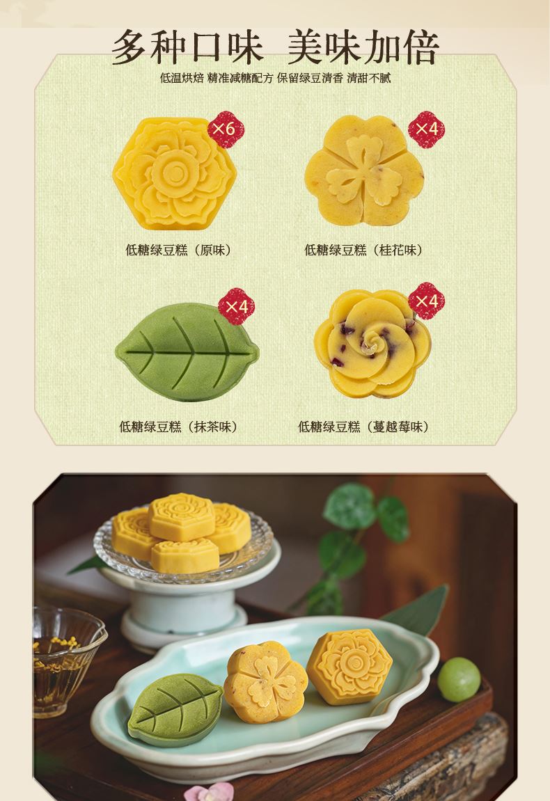 低糖绿豆糕(原味) 低糖绿豆糕(桂花味) 低糖绿豆糕(蔓越莓味) 低糖绿豆糕(抹茶味)