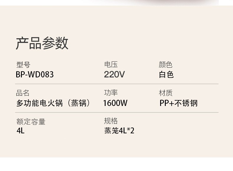 产品材质:PP 额定容量:1.0L 额定功率:350W 额定电压:220V~ 额定频率:50Hz 产品重量:0.35kg 产品尺寸:210*150*220(mm) 彩盒尺寸:250*157*180(mm) 装 箱 数量: 16 PCS 外箱尺寸: 650*515*380(mm)