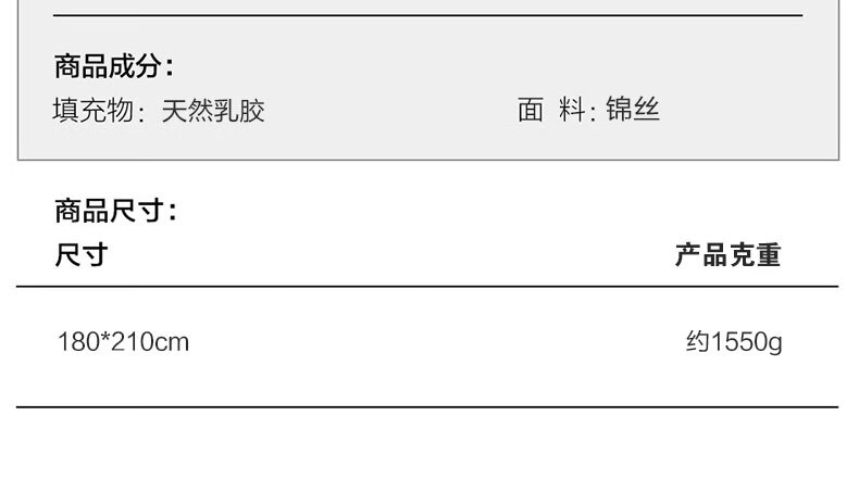 货 号:LK-8757 面 料:锦丝 填 充:乳胶 规 格:180*210cm 克 重:1550g