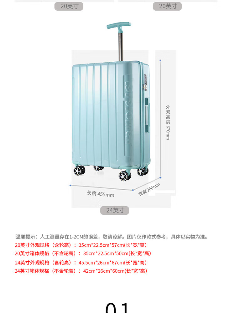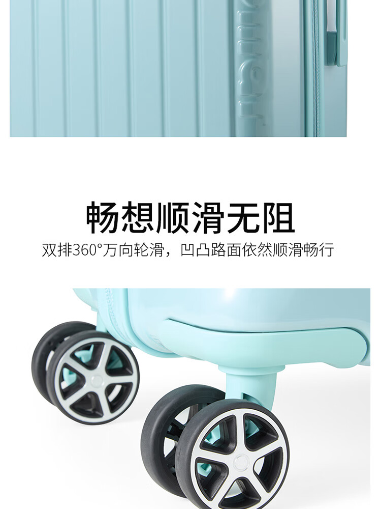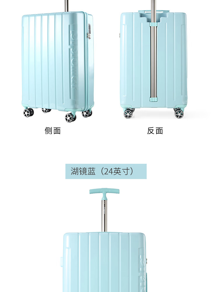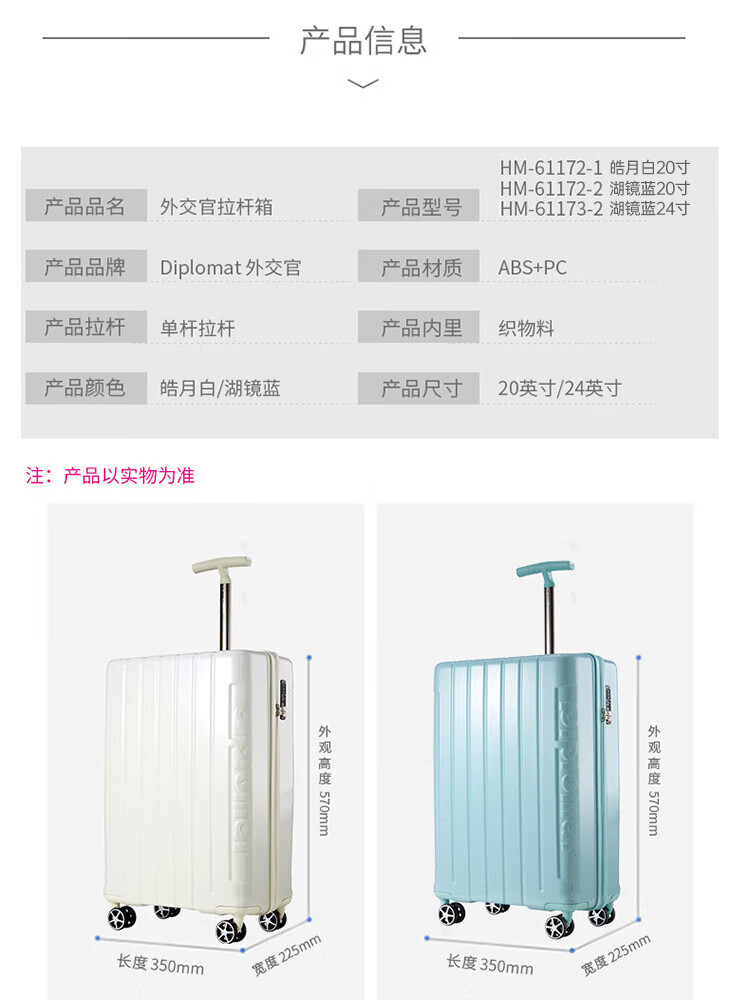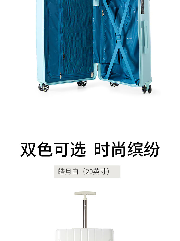 产品材质:ABS+PC 产品颜色:皓月白(-1)/湖镜蓝(-2) 外观尺寸:350*225*570mm /20英寸 产品条码:6958698324974 /20英寸
