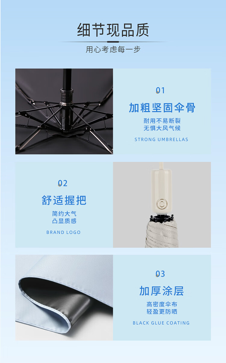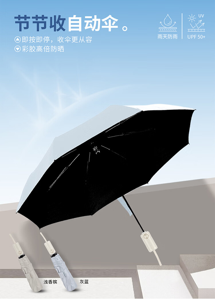 材 质:钢制+纤维伞骨全自动伞架、黑胶碰起布规 格:53.5CM x 8K颜 色:灰蓝、浅香槟、箱 规 :40PCS