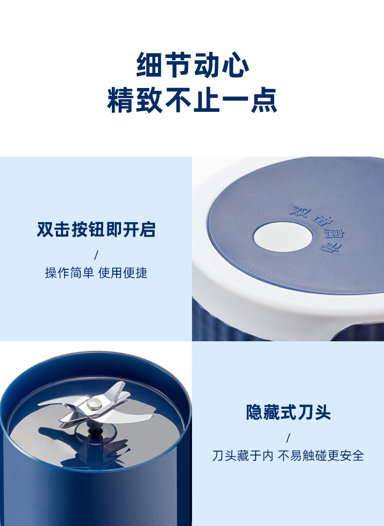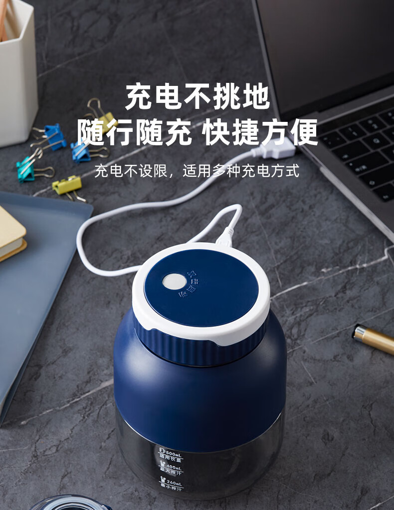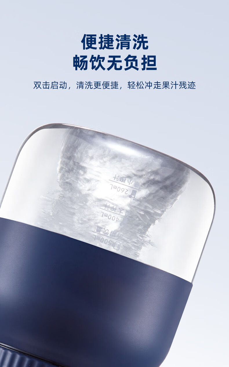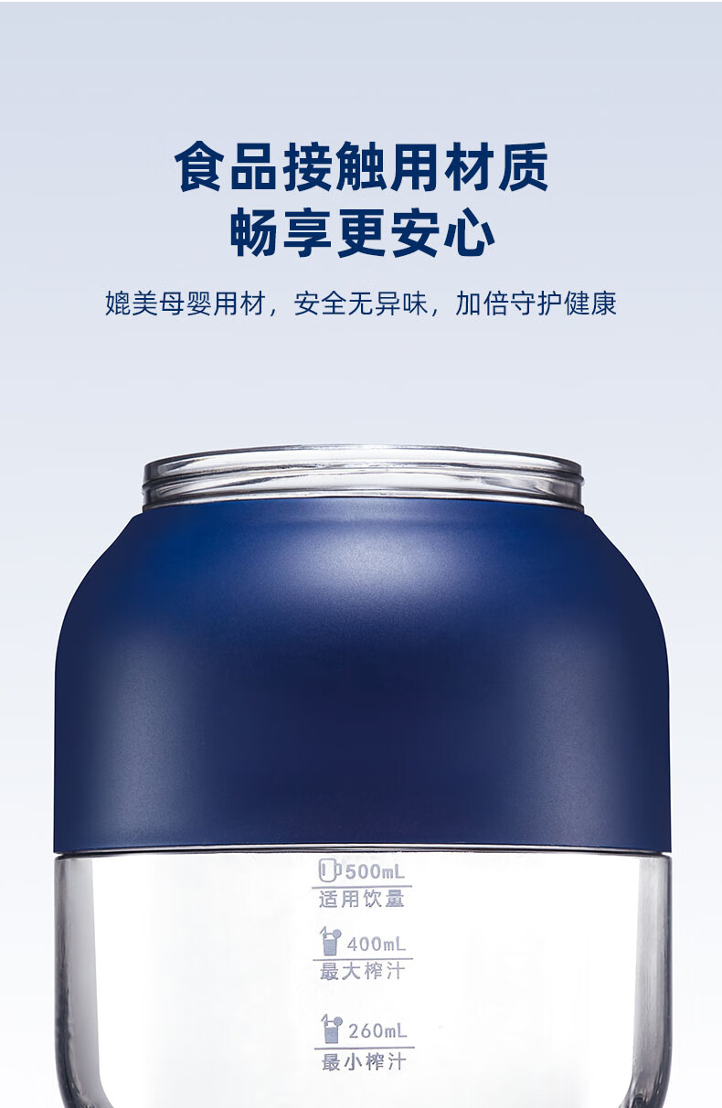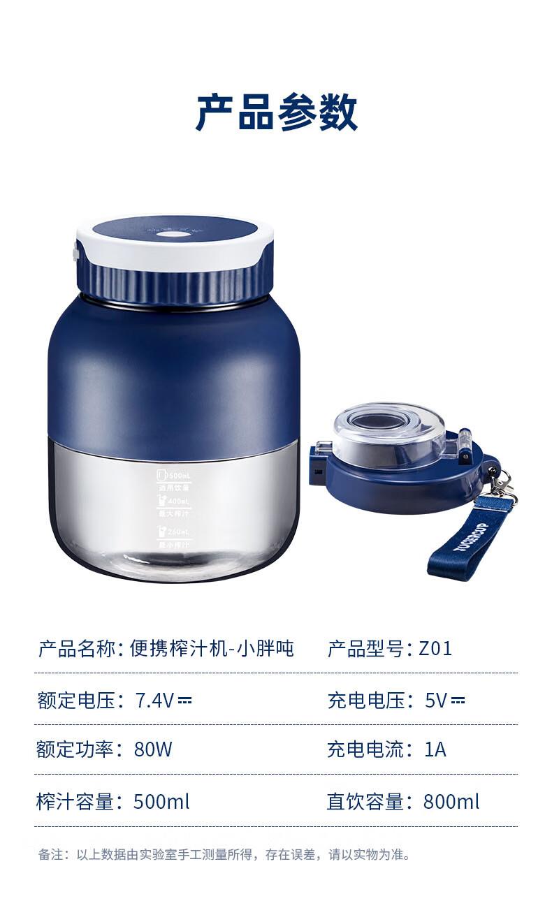 型 号:Z01 材 质:PC(食品级别) 直饮容量:800mL 榨汁容量:大500mL/260mL小 电池容量:2600mAh 额定电压:7.4V 充电电流:5V⎓1A 功 率: 80W 产品尺寸:145*110*110mm 包装尺寸:150*115*115mm