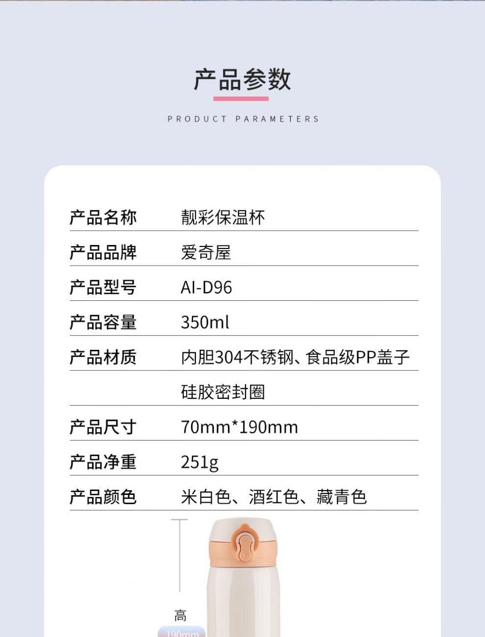 型号:AI-D96 颜色:A米白色;B酒红色;C藏青色 规格:350ml 装 箱率:50只/箱 材质:内304、外201不锈钢