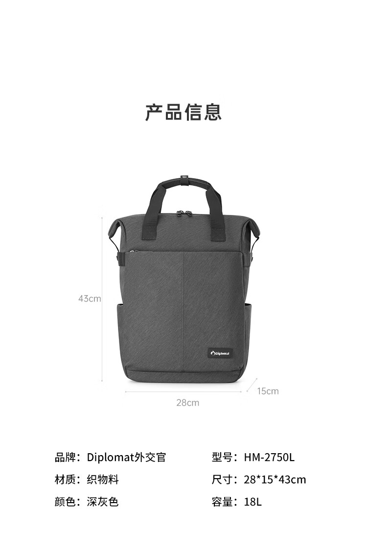 产品材质:织物料 产品颜色:灰色 外观尺寸:280*150*430mm 产品容量:18L 产品条码:6958698326367 装 箱数量:10pc