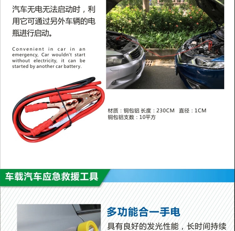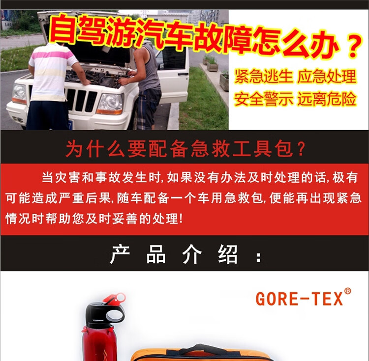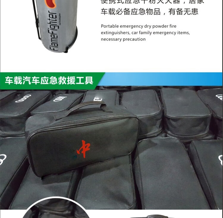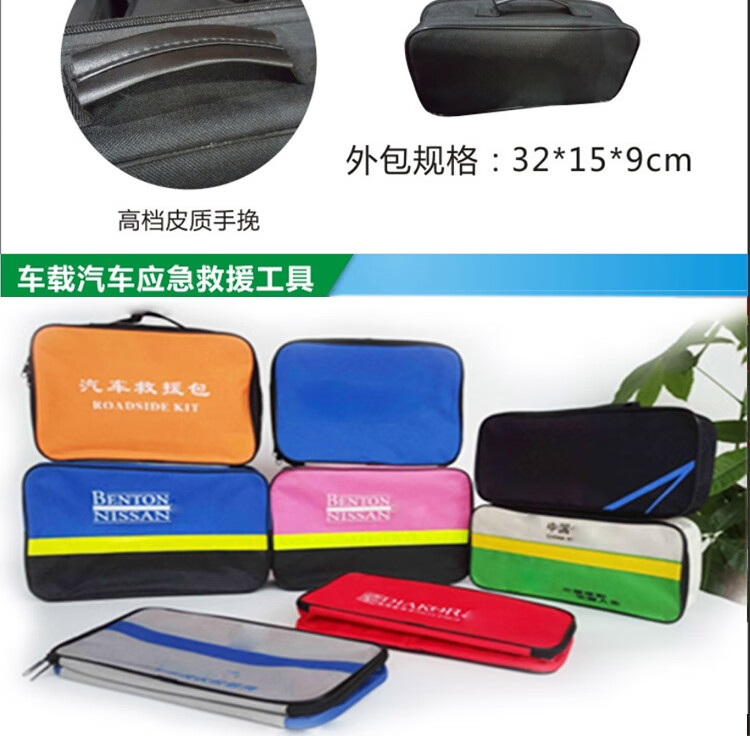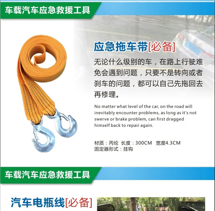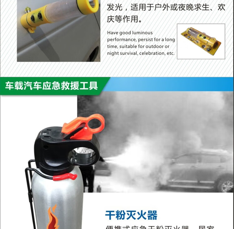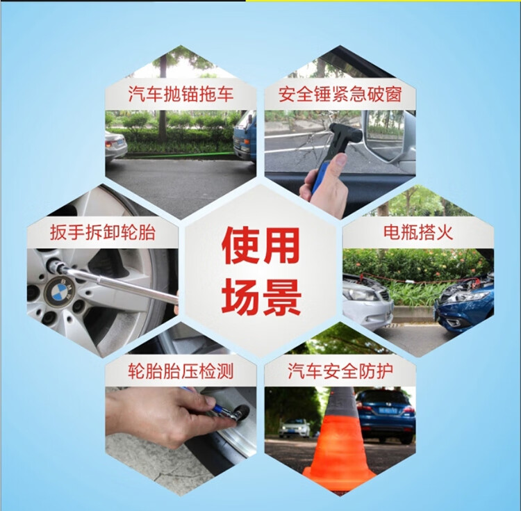 功能: 1.电瓶线 2.灭火器 3.拖车绳 4.安全锤 5.工具包