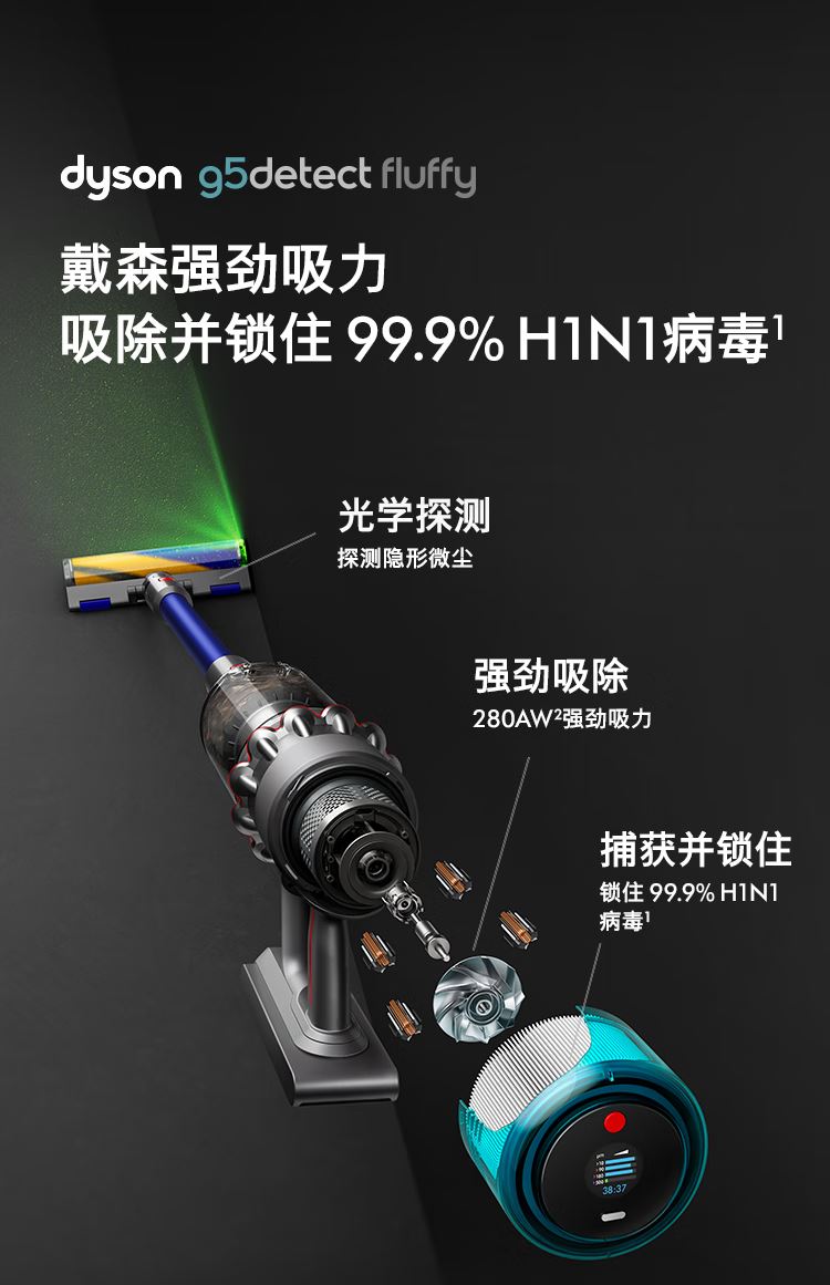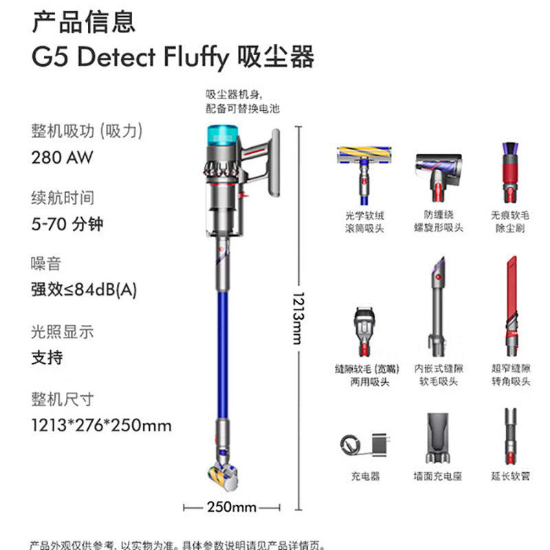 型号:G5detect fluffyVG5detect fluffy 机身重量:2.3KG 集尘筒容量:0.77L 地面运行时间:70分钟 充满电时间:3.5小时 适合地板材质:木地板;地毯 吸头及配件数量:含1个地板吸头及6个吸头及配件