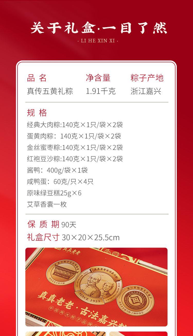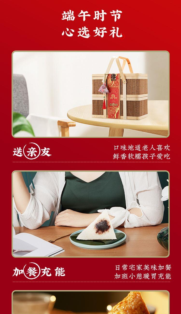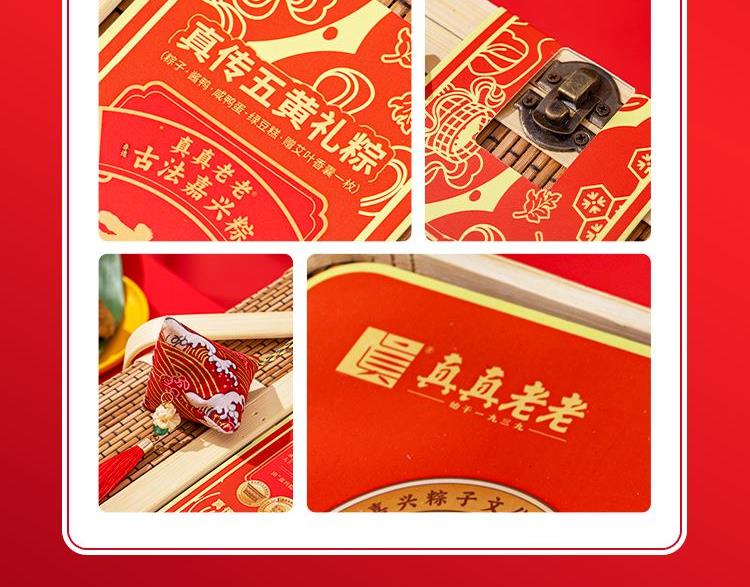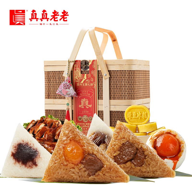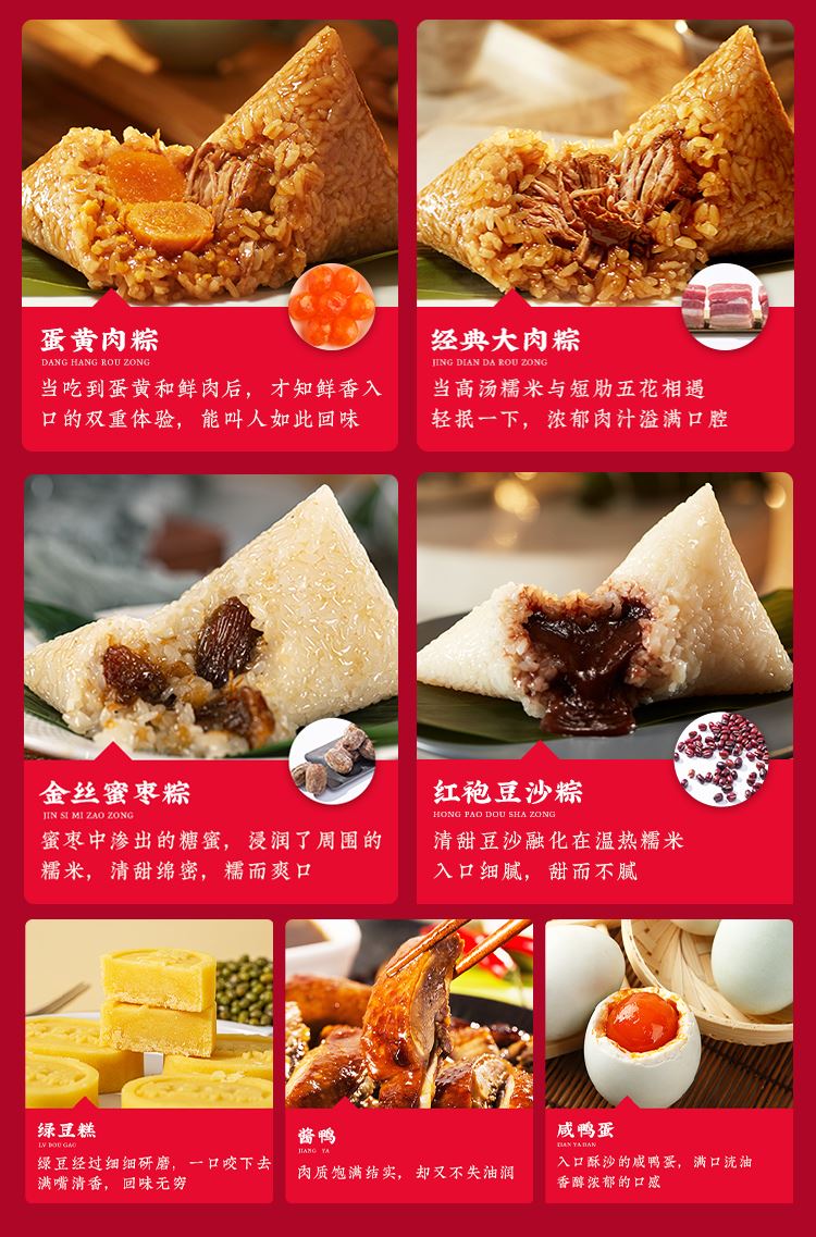 经典大肉粽:140克*1只/袋*2袋 蛋黄鲜肉粽:140克*1只/袋*2袋 金丝蜜枣粽:140克*1只/袋*2袋 红袍豆沙粽:140克*1只/袋*2袋 酱鸭:400g/袋*1袋 高邮特产咸鸭蛋:60克/只×4只 原味绿豆糕25g*6(保质期3个月) 纳福香囊一枚